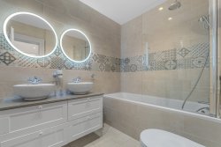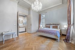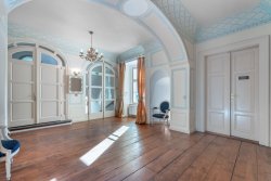 The main space is an elegant hall with a fireplace, which creates a majestic atmosphere, ideal for social gatherings. The hall connects to the terrace, which flows smoothly into the castle garden (4,253 m²) with a pond (1,536 m²), gazebo, and fountain. The garden is divided into two parts, the first of which is designed in a free, romantic English style, while the second is conceived in a formal, geometrically precise, symmetrical French style. On the ground floor of the castle, there is also a large apartment with bathrooms, an office, a bar, a wine cellar (26 m²), an elegant castle