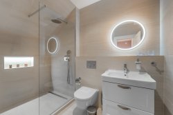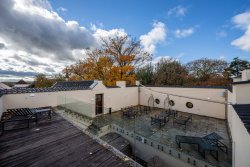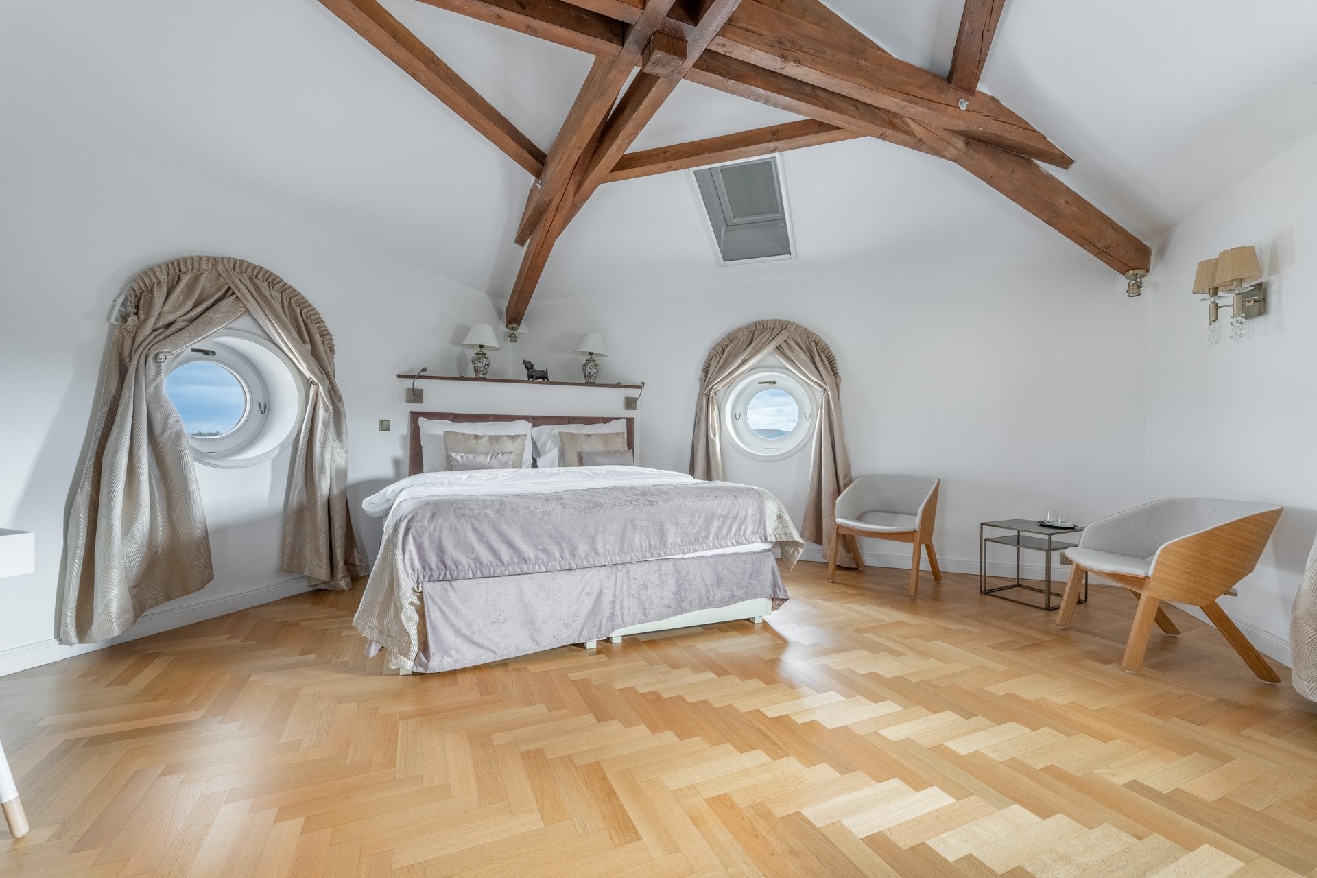 The next floor (304 m²) is mainly used for accommodation and wellness relaxation. There are six stylishly furnished rooms and seven bathrooms, three toilets, a urinal, a shower, two terraces, and two balconies with a total area of 96 m². The spacious roof terrace offers relaxation with a view of the surrounding countryside. There is a whirlpool (4 to 6 people), a Finnish sauna (6 to 8 people), and a massage room with two loungers. The ground floor features the aforementioned heated indoor pool. The tower (39 m²) with a viewing terrace (19 m²) crowns the entire building. Here you will find the Tower Suite with two bedrooms and another terrace with panoramic views.