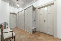 library, a dining room, and other utility rooms (three toilets, a bathroom, a day room for staff, a laundry room divided into clean and dirty sections, a workshop, a cloakroom, a fully equipped professional kitchen, two technical rooms with pumps, an elevator, and a garage. On the next floor (507 m²) there are four elegantly furnished rooms, three bathrooms, a kitchen serving as a preparation room, a salon, a grand hall, a smaller hall, a main and smaller dining room, a dance hall, three toilets, a cloakroom, an elevator, and a spacious terrace (92 m²).