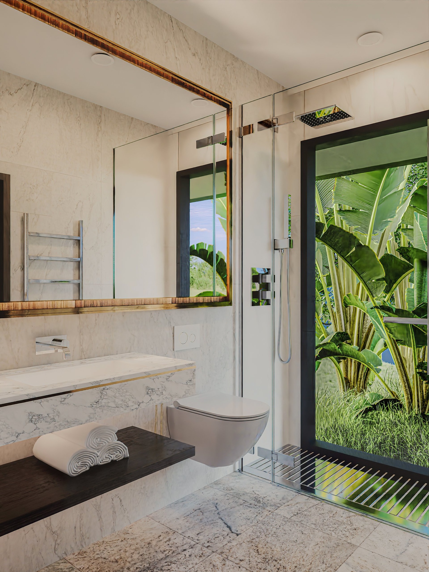 Villa Ballena stands on a plot of 900 sqm, the usable area of the house is 64 sqm and the layout is 2+kt. The living area with terrace is separated from the bedroom and bathroom by an entrance hall. Wood and ceramic tiles are standard in the interiors and it is possible to choose superior tropical woods. Special roofs protect from rain and sun without obstructing the view of the tropical garden. The roofs can also be supplemented with solar panels for even greater self-sufficiency. The plots of each villa have abundant springs and contain good quality fertile soil and are sensitively separated from each other, offering complete privacy.