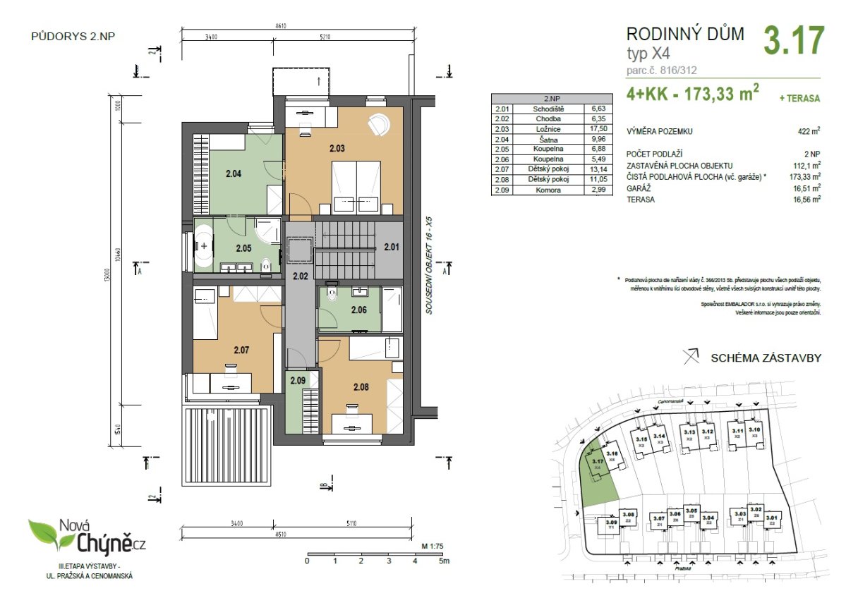 We offer a corner family house with a sunny garden in the project NEW CHÝNĚ, on the western outskirts of Prague - in the town of Chýně - with a commute of 14 km to the center of Prague. The project satisfies with the quality of the location, brick houses with practical layouts and gardens and technological sophistication. The offered house has a layout of 4+kt, a floor area of 173.3 sqm, a total usable area of 174.3 sqm, including a terrace of 16.6 sqm. It stands on a plot of 422 sqm with a garden of 310 m2. The house includes a garage for one car and one additional park. The parking is on its own plot.