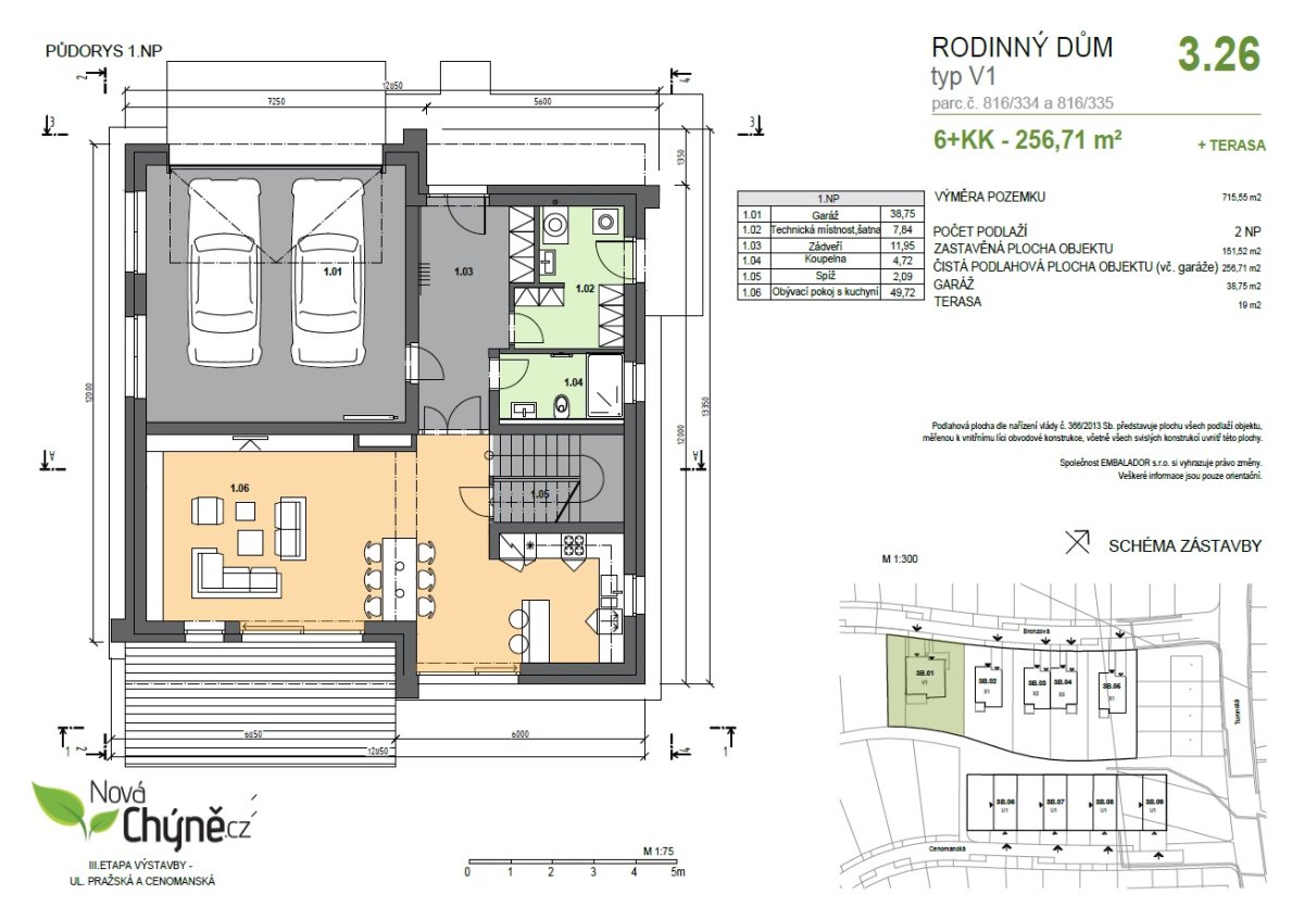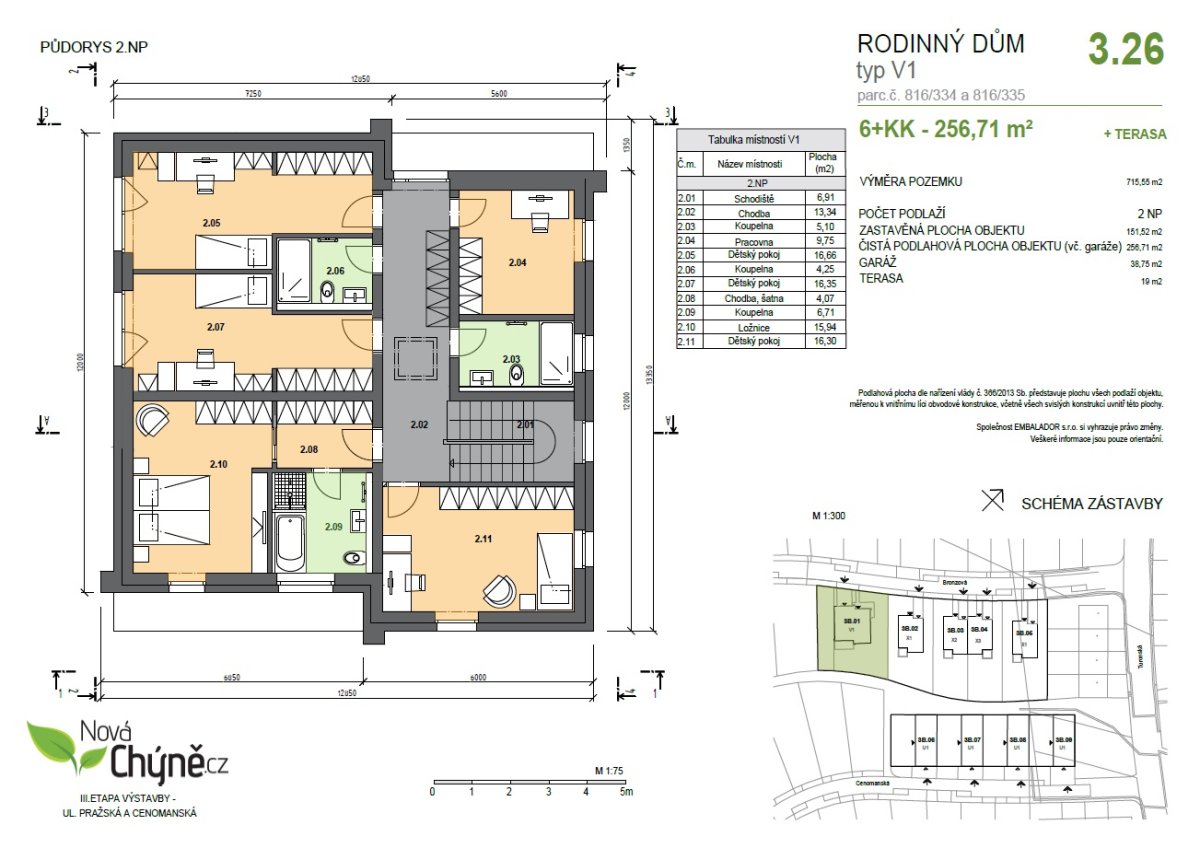 On the western outskirts of Prague with a commute of 14 km to the center of Prague, we offer in the Nová Chýně project a generous family house with a garden, a double garage and two parking spaces. Exceptional house in this project especially for its location (it is corner with a larger plot), construction and technical quality, great layout with three bathrooms and plenty of storage space and preparation for PV. The layout of the 6 bedroom apartment is spread over two floors with a total floor area of 256.7 sqm and a usable area of 249 sqm, including a terrace of 19 sqm. The total land area is 715.6 sqm, of which the built-up area is 151.5 sqm and the garden is 564 sqm. The house includes a double garage and an additional park. Parking on own land.