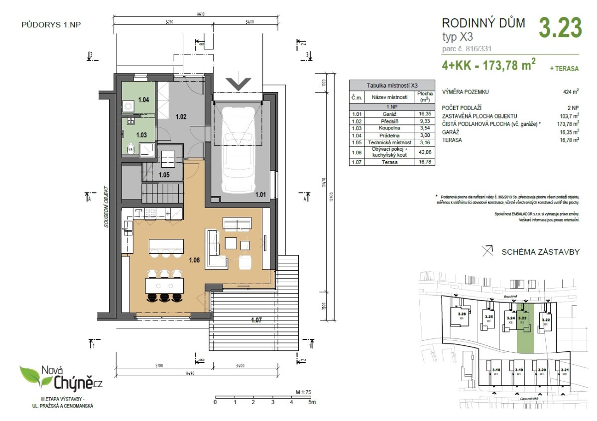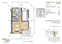 We offer a family house with a sunny garden in the project NEW CHÝNĚ, on the western outskirts of Prague - in the town of Chýně - with a commute of 14 km to the center of Prague. The project satisfies with location, quality of brick houses with practical layouts and gardens and technological sophistication. The offered family house has a layout of 4+kt, floor area of 173.8 sqm, a terrace of 16.8 sqm. It stands on a plot of 424 sqm with a garden of 320 sqm. The house includes a garage for one car and one additional park. The parking is on its own plot.