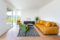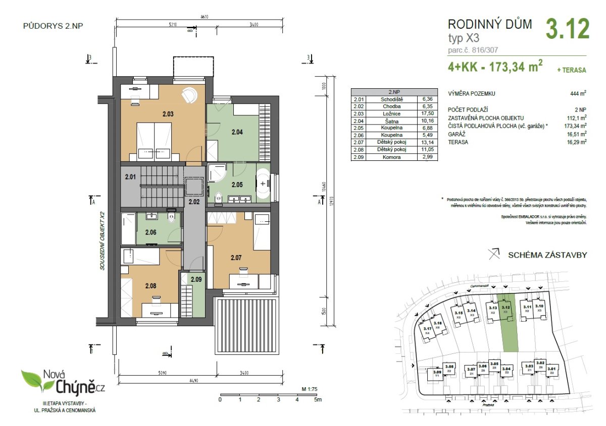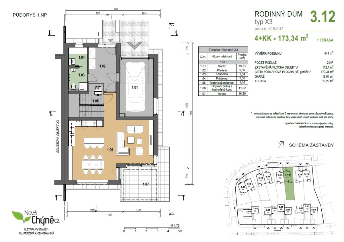 We offer an economical family house with a garden in the project NEW CHYNĚ, on the western outskirts of Prague - in the village of Chýně - with a commute of 14 km to the center of Prague. The project satisfies with its location, quality of brick houses with practical layouts and gardens and technological sophistication. The offered family house is brick, has a layout of 4+kt+G, floor area of 173.3 m2, total usable area of 173.3 sqm, including a terrace of 16.3 sqm. It stands on a plot of 444 sqm with a garden of 332 sqm. The house includes a garage for one car and one additional park. The parking is on its own plot.