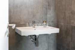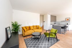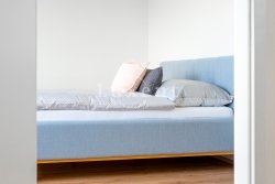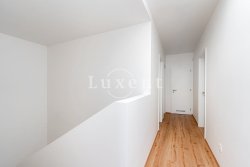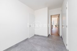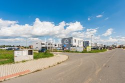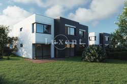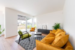 On the ground floor there is a hall, bathroom, laundry room, tech. room and a large living room with kitchenette (42 sqm) massively glazed into the garden with terrace. On the ground floor there is also an integrated garage. Upstairs there is then a master bedroom with en-suite bathroom and dressing room, two bedrooms with a second bathroom and a spacious storage room. The corridor above the staircase is illuminated by a skylight. See attached floor plans for more details. On the floors there is quality laminate floating flooring (decor according to the house) and ceramic tiles. Bathroom equipment: Villeroy & Boch.