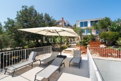 On the ground floor, there is a spacious living room with access to the terrace, a kitchen with a dining area, a hallway, two bedrooms, and two bathrooms. Upstairs, there is a third bedroom with its own bathroom and balcony. The well-maintained garden with Mediterranean plants offers another terrace by the sea, an outdoor kitchen, a seating area with a barbecue, and a shower. In front of the house, stairs lead directly to the sea and there is the possibility of mooring a small boat.