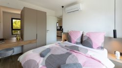 The ground floor features a spacious 77.95 sqm apartment with two bedrooms and an open-plan living area designed for maximum comfort. The first floor consists of two apartments with separate entrances — a two-bedroom apartment of 45.42 sqm and a one-bedroom apartment of 33.54 sqm. Each unit offers a high level of privacy and comfort.