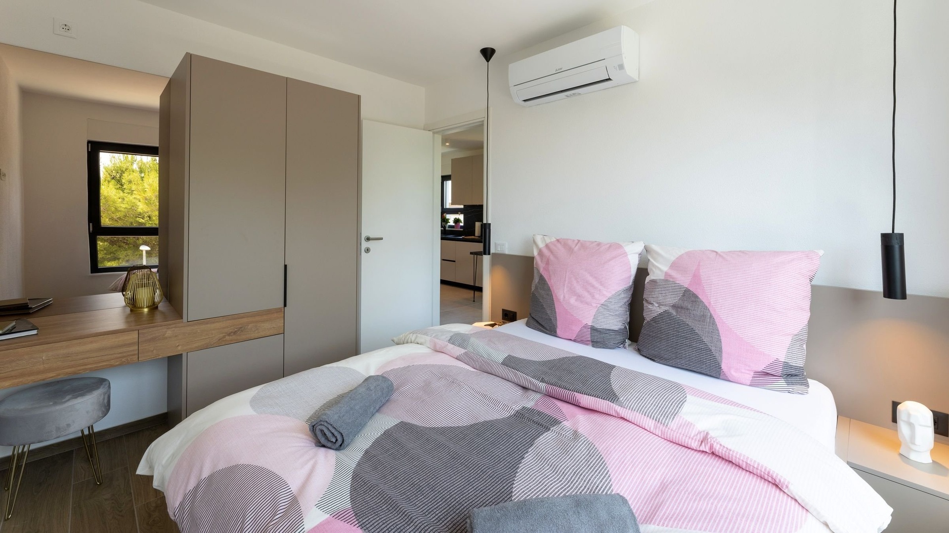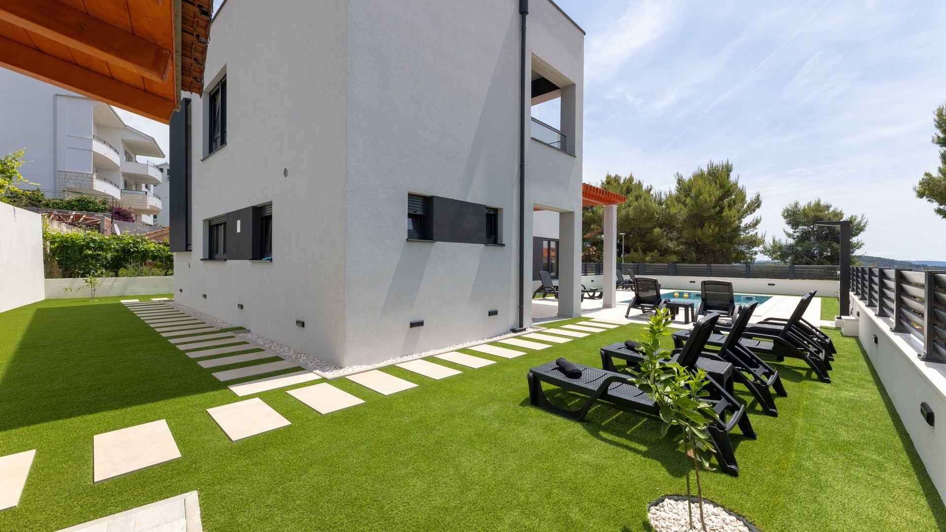 The villa boasts an exceptional location with excellent accessibility — Split International Airport is only 4.6 km away, while the historic center of Trogir, known for its rich cultural and gastronomic offerings, is just a short drive.