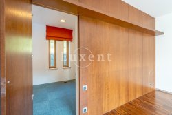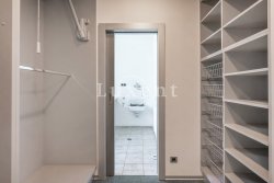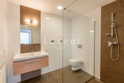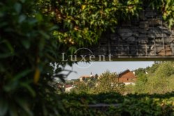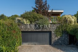 Most of the first floor area is designed as an open and connected living space, in which the living room with dining room and kitchen (56 sqm), loggia (27 sqm), conservatory (17 sqm) and atrium (26 sqm) are seamlessly connected. The common living area is equipped with stylish fireplaces and custom-made furniture in line with the character of the house. There is a private area at the back. The master bedroom (17 sqm) with a library (5 sqm) opens onto the atrium through glass doors, there is also a study (6 sqm), a bathroom (10 sqm), a spacious dressing room (12 sqm), a utility room and a separate toilet (3 sqm). A circular cast-iron staircase located in the living room connects this floor with the lower floor, where there are two bedrooms (15 and 21 m²), a bathroom (5 sqm) and a utility room. In its lower part is the entrance to the detached garage (42,3 sqm) with space for two cars, with a toilet with sink and a utility room that can be used as a cellar.