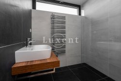 RD 4 is a basement, family house with a layout of 7+kt, with a total floor area of 350 sqm and a plot of 1331 sqm. On the ground floor there is a spacious entrance hall with a corridor (21.5 sqm), where a large space for the installation of wardrobes is foreseen, a bathroom with shower, a separate toilet, a utility room with heat pump, a study (19.9 sqm), a guest room (17.6 sqm) and a living room with kitchen (81.6 sqm), which is beautifully separated, taking advantage of the multi-level space on the ground floor. From the generous light-filled living room and kitchen there is access to the terrace and the garden of the house. A nice detail and dominant feature of this space is the glass corner that passes from the living area to the kitchen and provides access to the terrace.