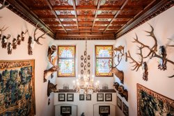 In addition to the castle, the property also includes an adjacent building divided into two parts. In the first part, measuring 470 sqm, there are two perfectly renovated apartment units equipped in the same style as the main castle building. On the ground floor there is a technical bathroom and four rooms with vaulted ceilings. In the second part of the building (which is 480 sqm) there are currently facilities for the operation of the castle. This second part originally served as a hall with a balcony and a stage. In the future, this original purpose could easily be put back into operation and the social spaces could be expanded with outdoor seating. In total, the property has 30 rooms.