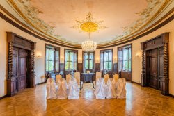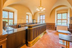 The chateau itself is a one-story building with a northern wing built onto the foundations of the original Renaissance residence. In the vaulted entrance hall (112 sqm) is the staircase to the first floor and doors to the both wings. The wooden staircas is lined by balustrade railings. Window niches and indented windowsills are equipped with wooden carvings. Between the entrance to the oval hall and the entrance to the adjacent room is a mirror behind which hides a slim spiral staircase, a secret entrance to the rooms in the tower (77 sqm). This first-floor landing above the staircase leads to seven rooms and the main representative hall (75 sqm), which is located directly above the ground floor in an oval bay. We can enter it through three doors from neighboring rooms and halls. The door is set in richly carved woodcraft, a high point of the social elegance of the castle. The flat ceiling of the hall has rich embossed stucco decoration. A glazed door leads to a balcony lined with stone balustrades overlooking the castle park. In the nothern wing, the original Renaissance cellars with an area of 114.9 sqm have been preserved. They can serve as a wine shop or bar. On the ground floor the owner built a stylish café and bar (86 sqm), as well as toilets and two apartments of 31 sqm and 26 sqm. Four apartments of 42 sqm, 41 sqm, 29 sqm and 40 sqm were created on the first floor.