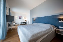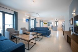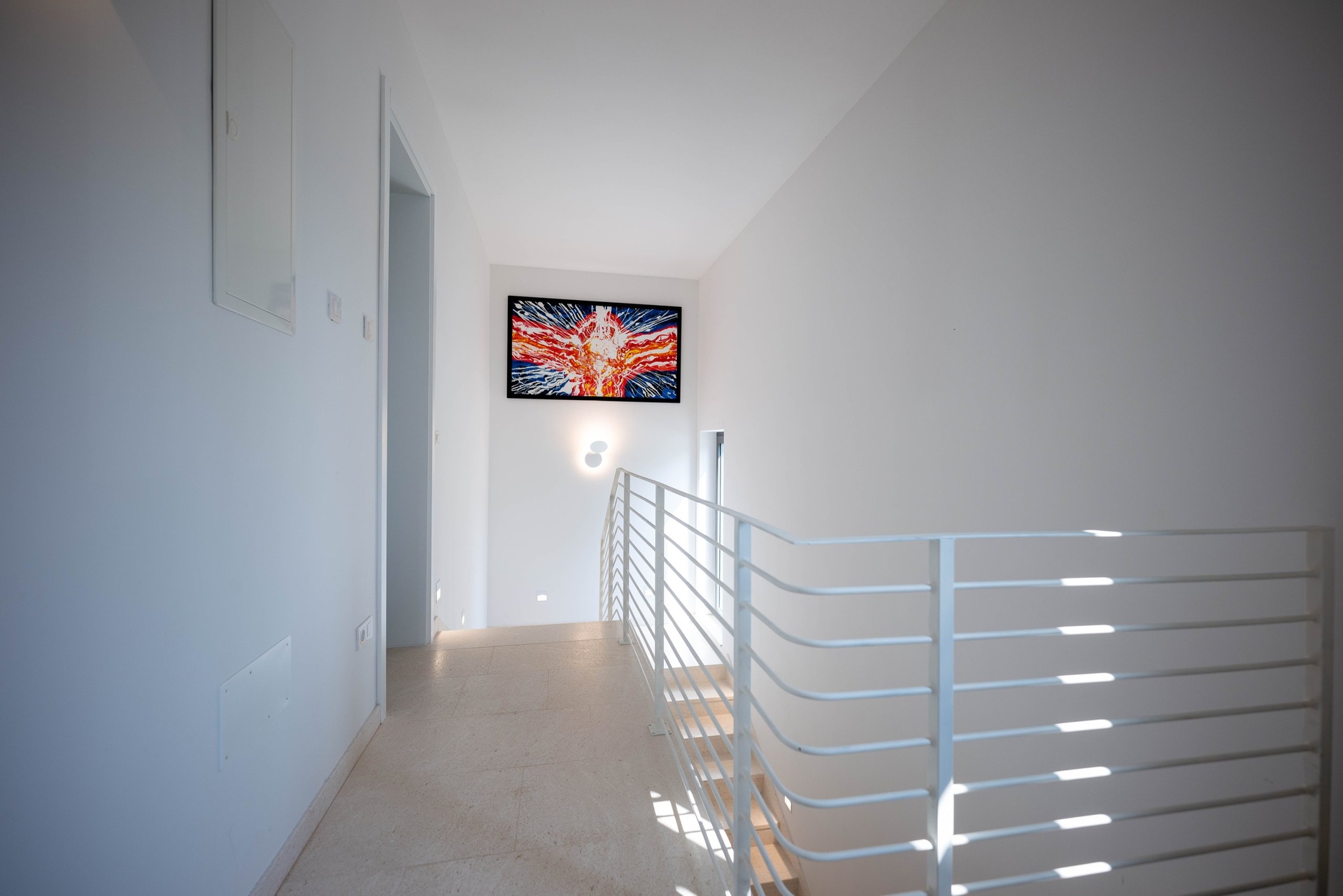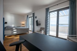 Upstairs, you will find three bedrooms—each with a private bathroom or walk-in wardrobe—as well as a study that can be easily adapted to your needs. A large balcony offers stunning panoramic views of the sea and surrounding islands.