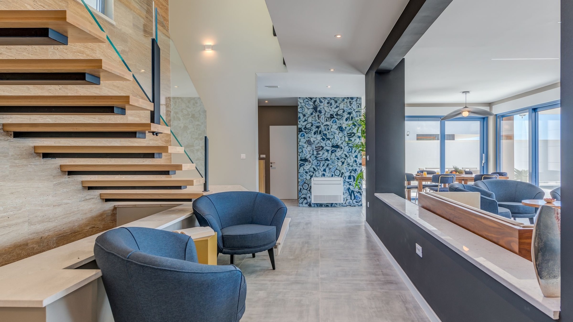 From the ground floor, stairs lead to two floors in the basement, which are mainly used for relaxation and entertainment. The first level offers a fitness area, sauna, bathroom and an indoor relaxation area with direct access to the terrace connected to the outdoor heated pool and sun loungers. One floor below is a large indoor swimming pool, jacuzzi and another wellness area, ideal for the winter months or an evening relaxing in complete privacy.
