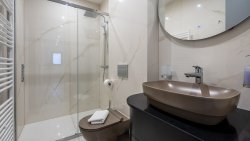 The basement serves as a technical and parking area, with two garages and outdoor spaces. The ground floor includes a bright living room connected to a dining area and a fully equipped kitchen, with direct access to the terrace and pool. This floor also hosts one bedroom, a bathroom, and a separate toilet. On the first floor, there are four comfortable bedrooms, each with its own en-suite bathroom and a private balcony, ensuring maximum privacy and comfort for all guests.