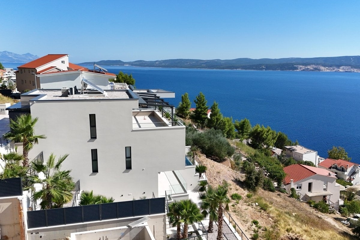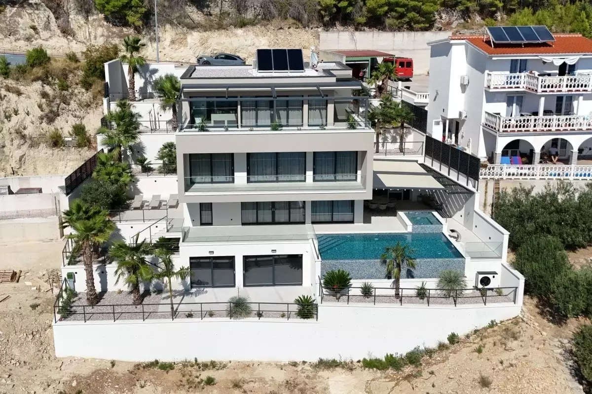 We offer for sale a luxurious modern villa just 250 meters from the sea, in a quiet village near Omiš. The villa is built of high-quality reinforced concrete with excellent thermal and sound insulation and using the best materials. On a plot of 600 m², there is a spacious living area of 450 m². The villa is fully furnished and ready to move in immediately.