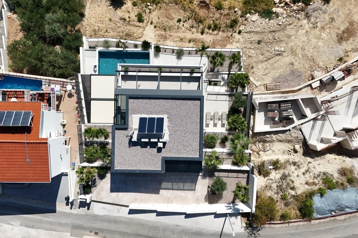 The property is spread over several floors with a well-thought-out layout. On the upper floor is the master bedroom with its own bathroom and a spacious 44 m² terrace, next to which is a double garage inside the building. The first floor offers four bedrooms, each with its own bathroom, and a dressing room with an island. The ground floor consists of an open-plan living room connected to the kitchen and dining room with access to a covered terrace and swimming pool. The lower floor features a relaxation area with a home cinema, sauna, fitness room, and laundry room, with panoramic sea views from all rooms.