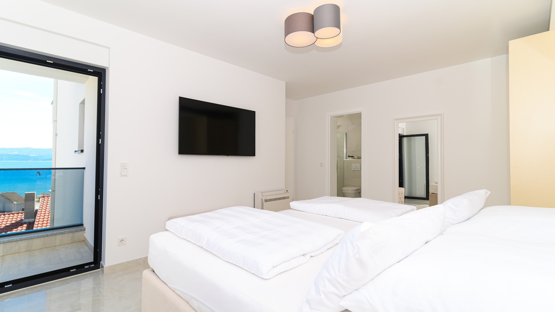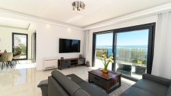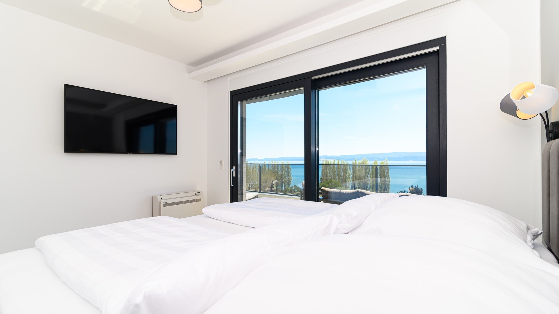 On the second and third floors, there are two identical residential units – each consisting of two bedrooms with en-suite bathrooms, an open-plan living area connecting the kitchen, dining room, and living room with access to a loggia overlooking the sea, and a separate toilet.