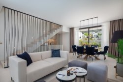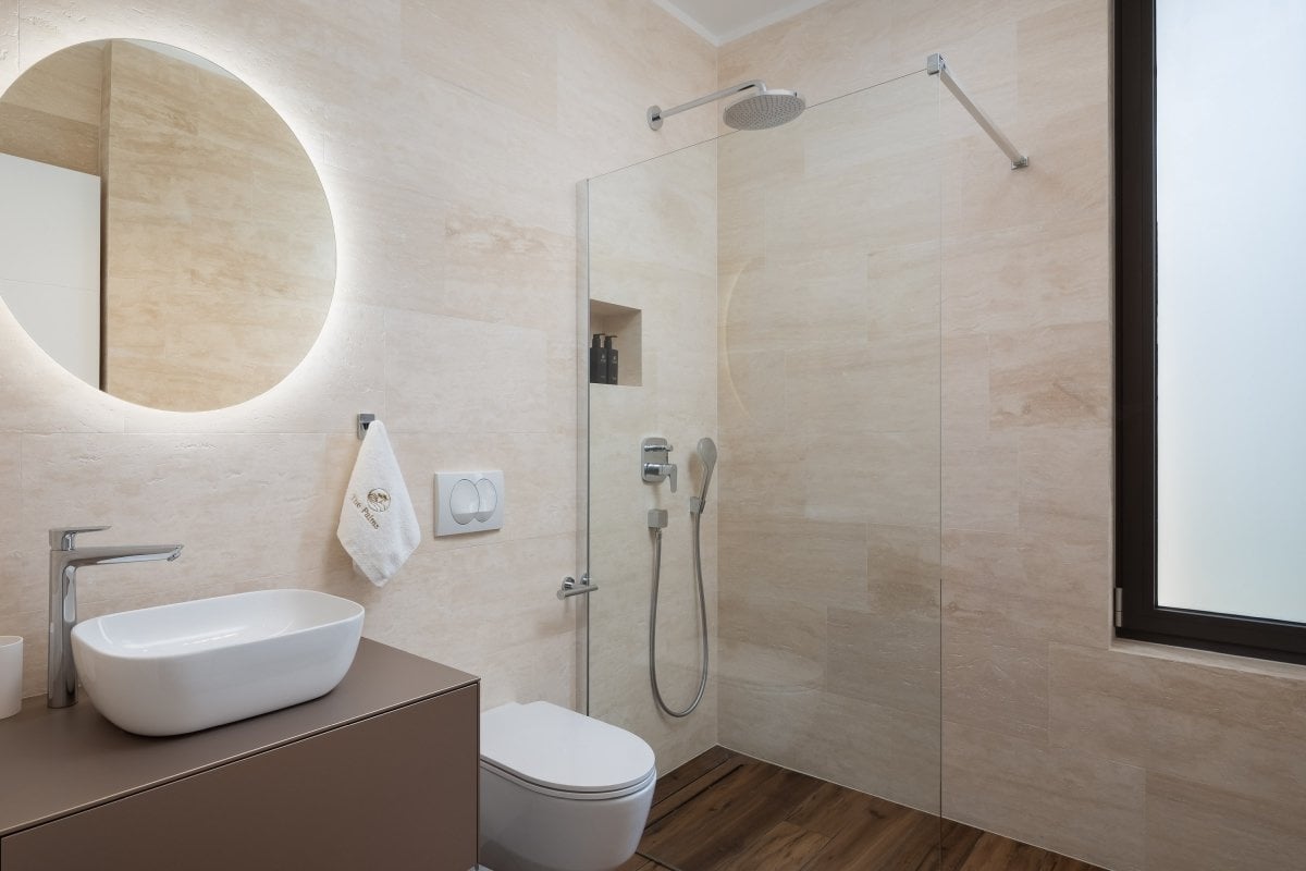 An elegant interior staircase leads to the upper floor, which includes three air-conditioned bedrooms. The master bedroom has an en-suite bathroom and offers a stunning sea view, while the other two bedrooms share a second bathroom. The interiors are thoughtfully designed in a modern minimalist style with natural elements. The villa is built with high-quality materials and equipped with premium technologies—underfloor heating, security doors, and other features ensure maximum comfort and safety.