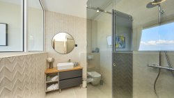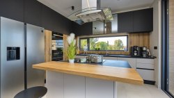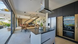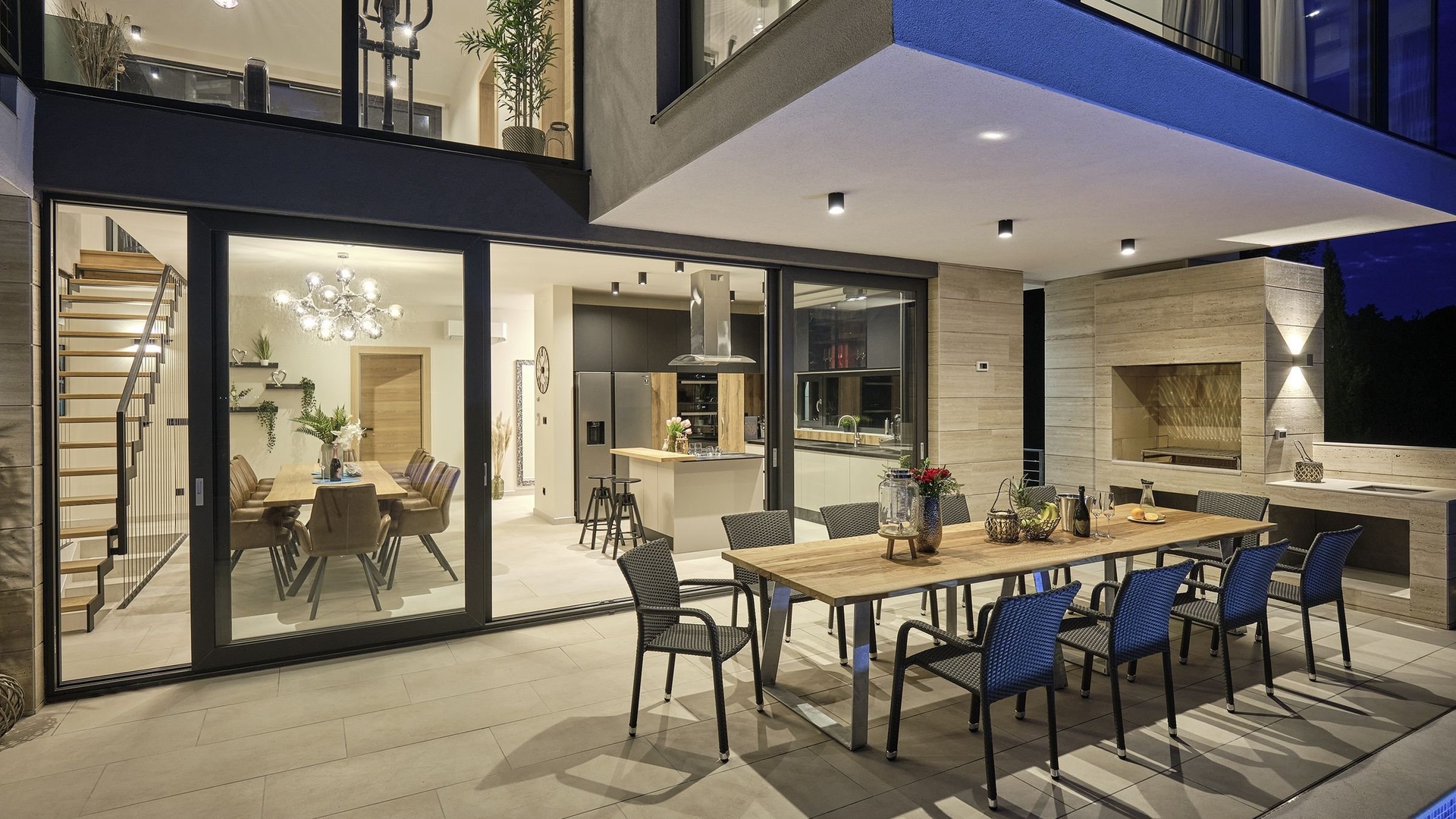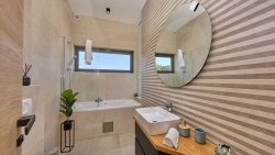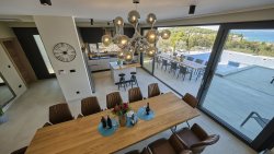 On the ground floor there is a comfortable bedroom with en-suite bathroom, sauna with additional bathroom, fitness room, tavern with indoor barbecue and billiards, laundry room and garage. The first floor consists of a bedroom with bathroom, separate toilet, designer kitchen with dining area and spacious living room, which flows seamlessly onto the terrace with hot tub, heated pool and relaxation area.