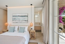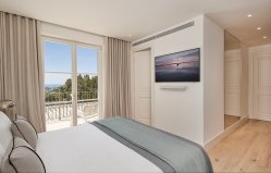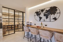 The villa has five spacious bedrooms, three of which are located in the main house and two in a separate guest wing, each with its own bathroom and terrace. The spacious living area with fireplace flows seamlessly into the terrace with heated natural stone seating and outdoor kitchen, ideal for barbecues and social events. From the designer Poliform kitchen and elegant dining room, enjoy views of the harbour from sunrise to sunset.
