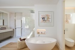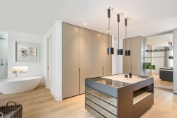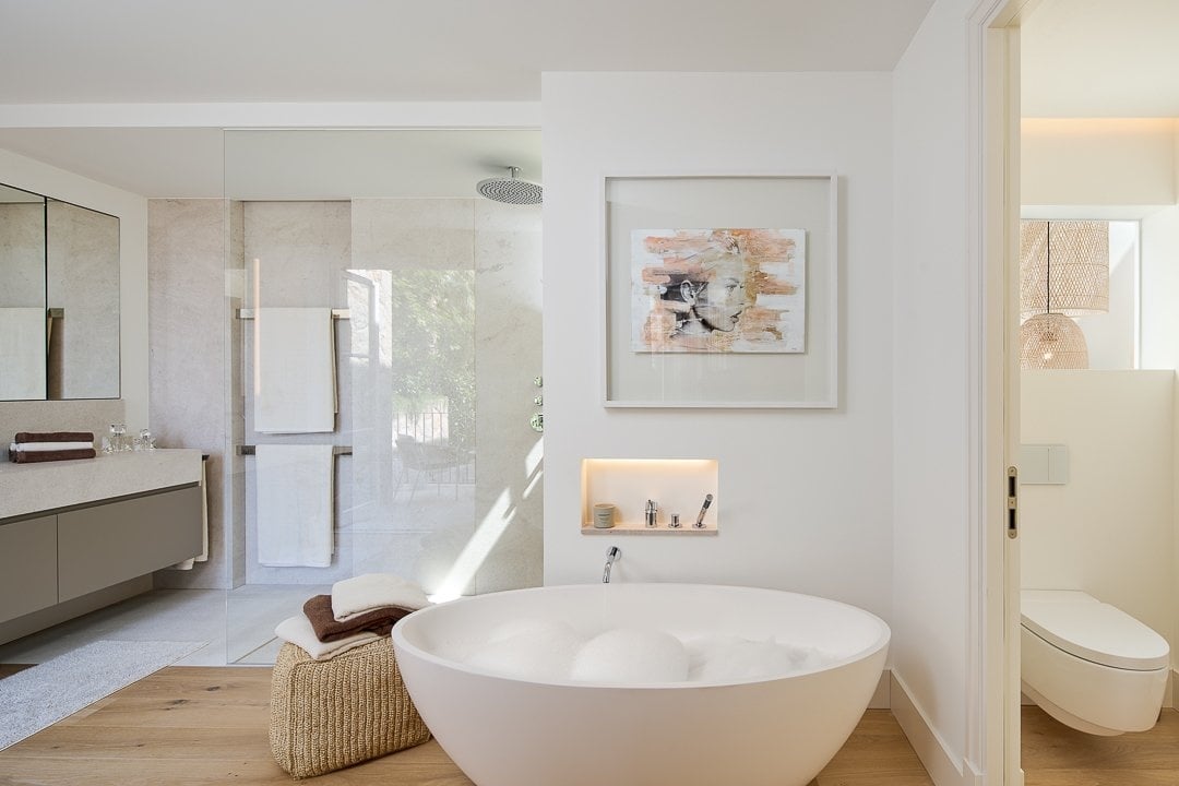 On the upper floor, you will find the 60 sqm master bedroom, with a spacious walk-in closet and a luxurious bathroom with a freestanding bathtub, rain shower and private terrace. The entire house is equipped with high quality materials, including oak parquet floors in the bedrooms, underfloor heating in all living rooms and branded appliances.