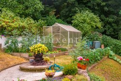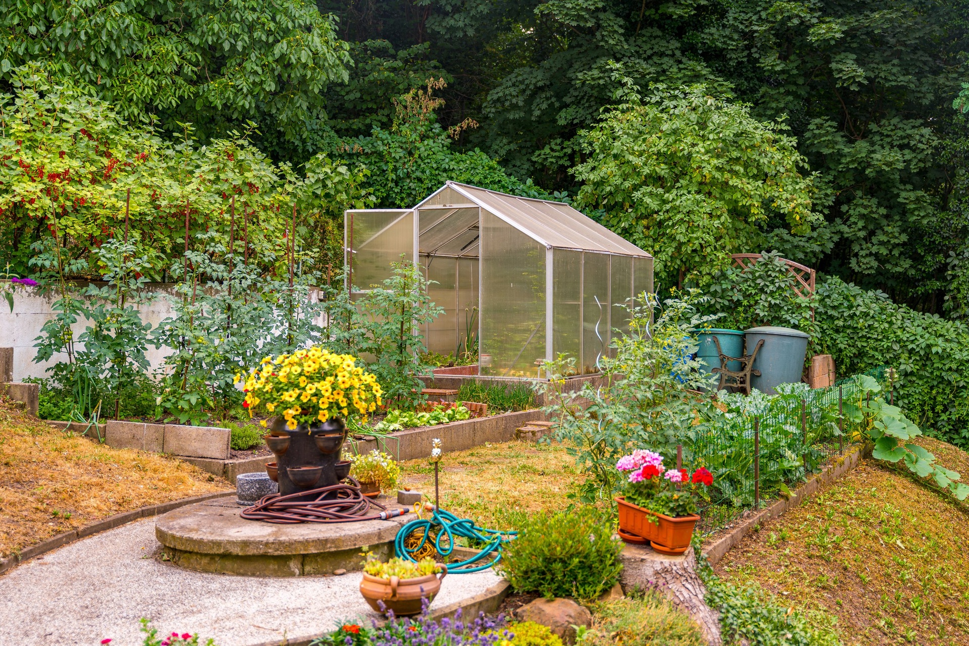 Thanks to the sloping terrain, the garden is divided into several sections and offers a number of pleasant nooks. There is a pergola with seating, an outdoor cellar, storage space for garden tools, and space for growing vegetables, fruit, and flowers.