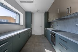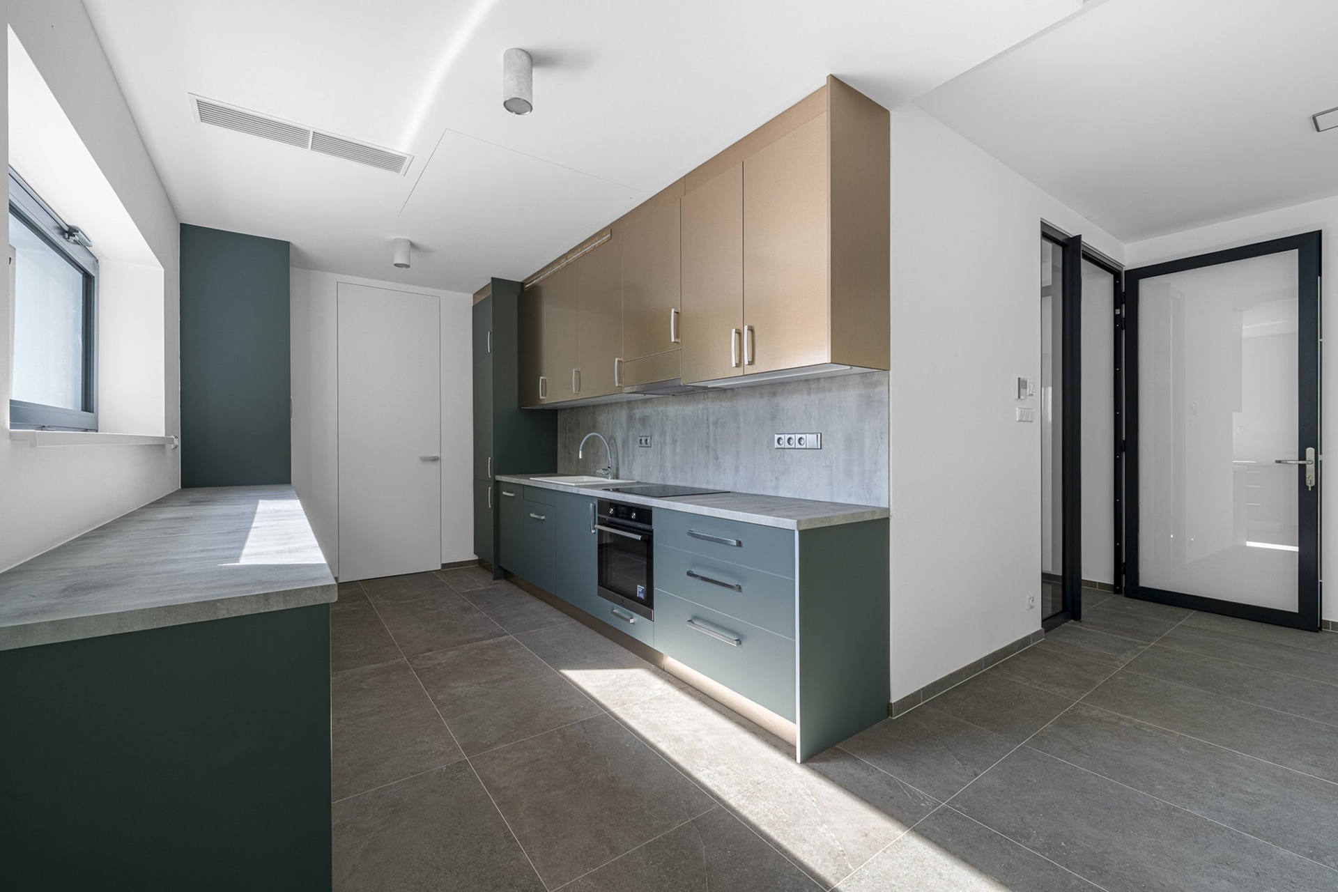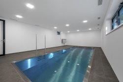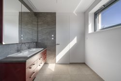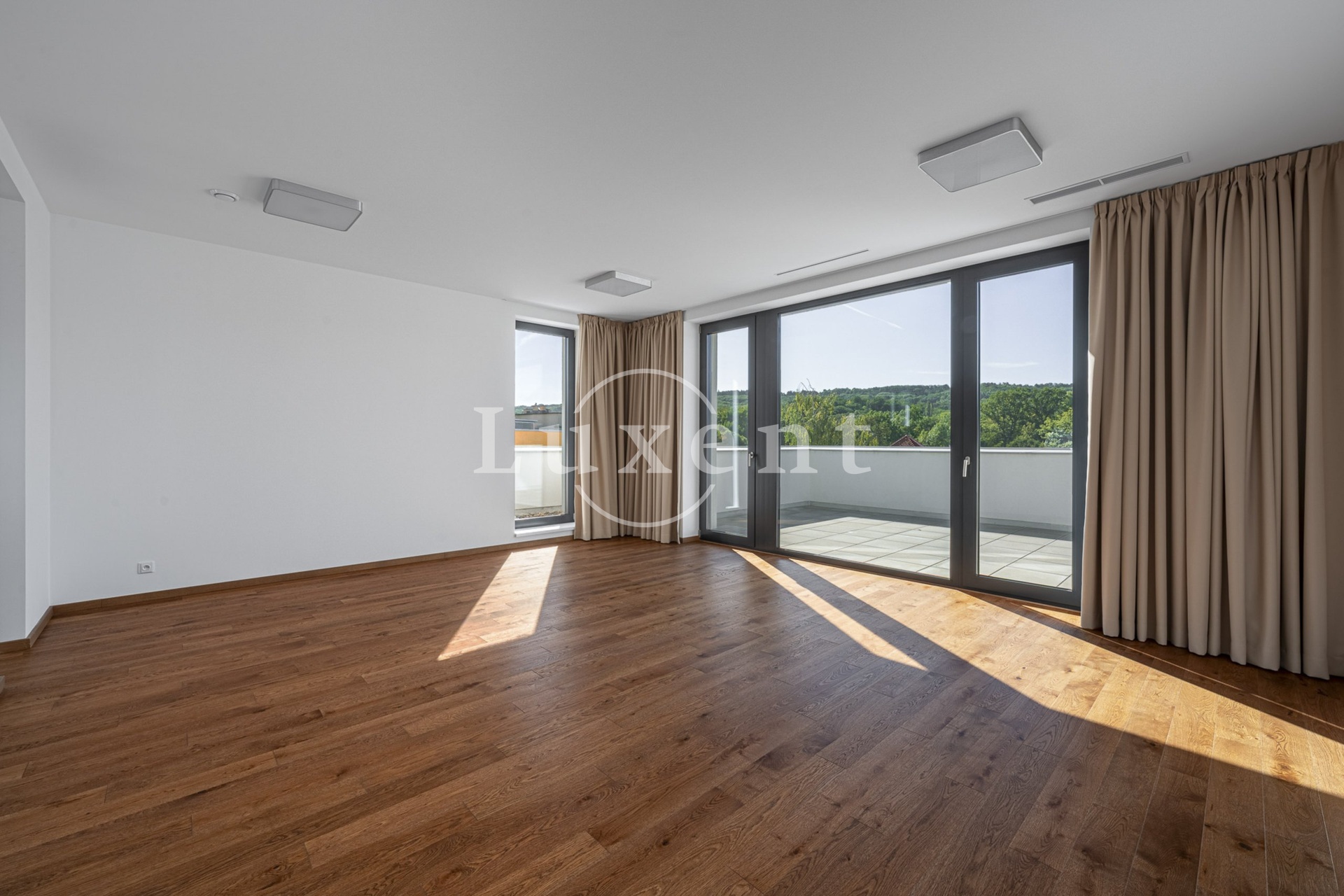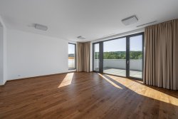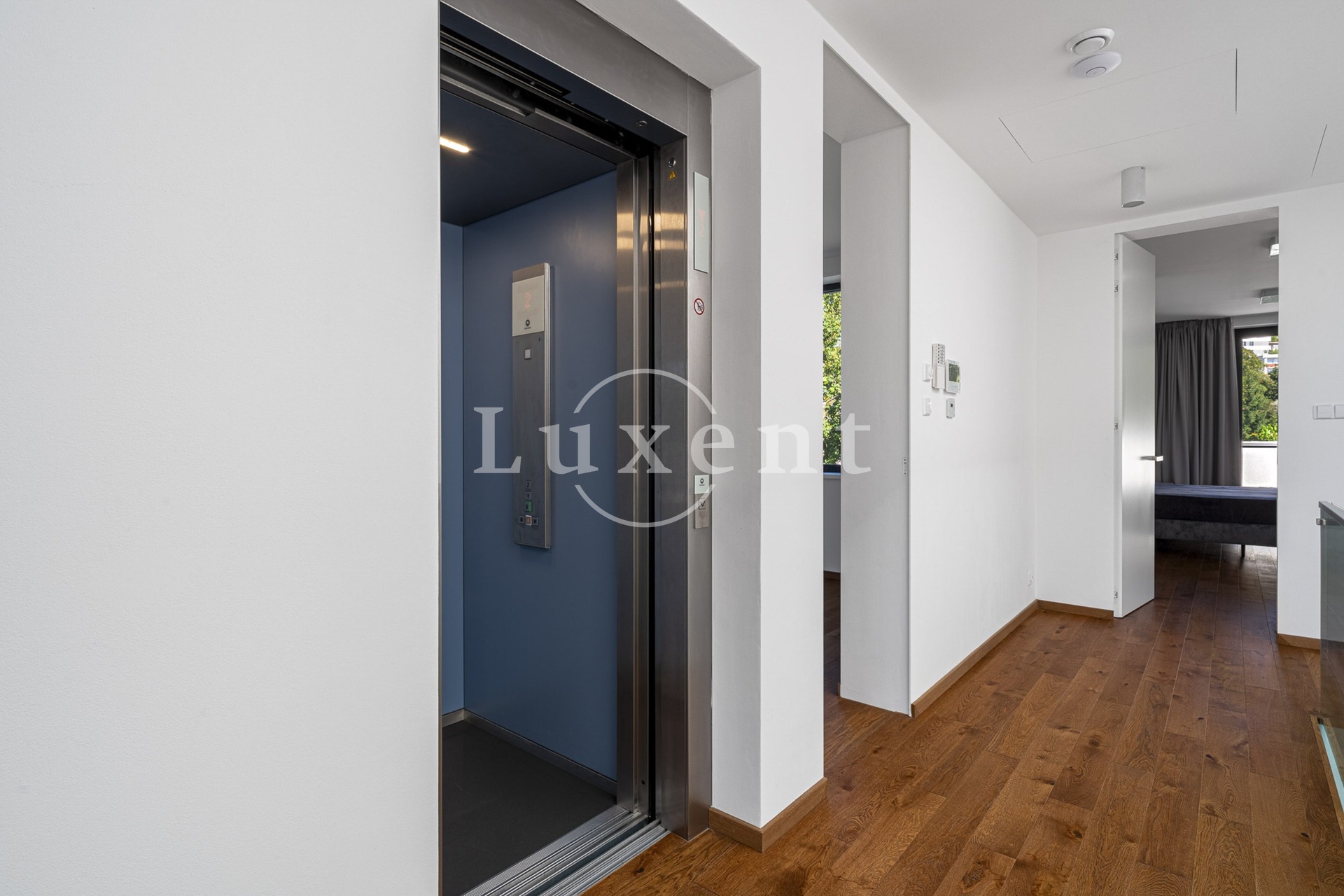 The villa has one underground floor and two above-ground floors. The first underground floor features an entrance hall with storage space, a three-car garage, a room with technical facilities for the house, a wellness area with an 8-meter swimming pool, a Finnish and infrared sauna with a salt panel, a bathroom, and a fitness room. This floor also provides access to a separate 3+kk apartment located on the first above-ground floor. The apartment has a south-facing terrace and can be used independently of the villa. The first above-ground floor features a generous social area – a spacious living room with a dining room and a kitchen equipped with modern appliances and a separate pantry. From here, there is direct access to the terrace and further to the rear of the garden, which ensures complete privacy thanks to the mature trees and shrubs of the adjacent properties. On this floor, there is also a spacious room with a terrace that can be used as a study or playroom.