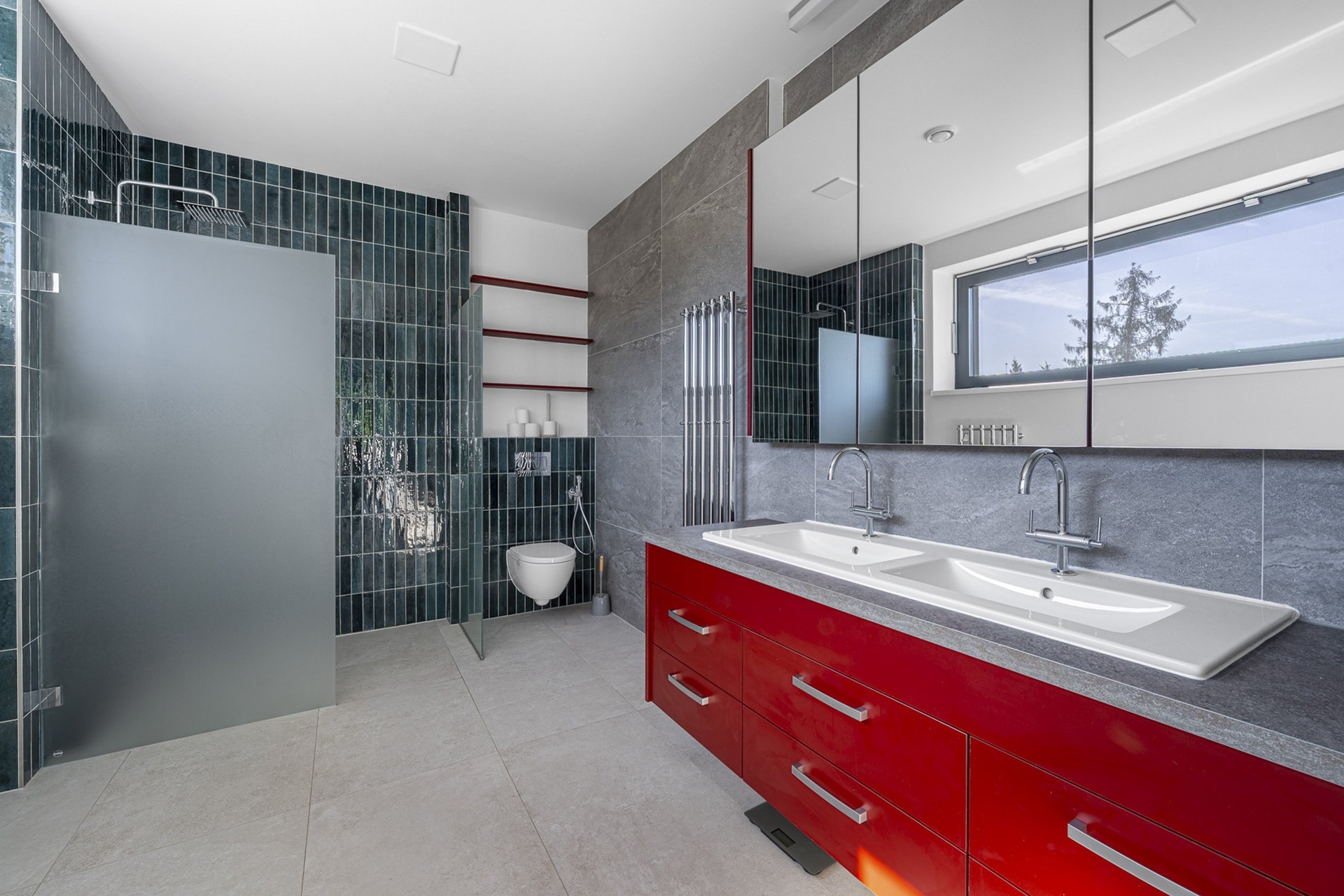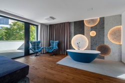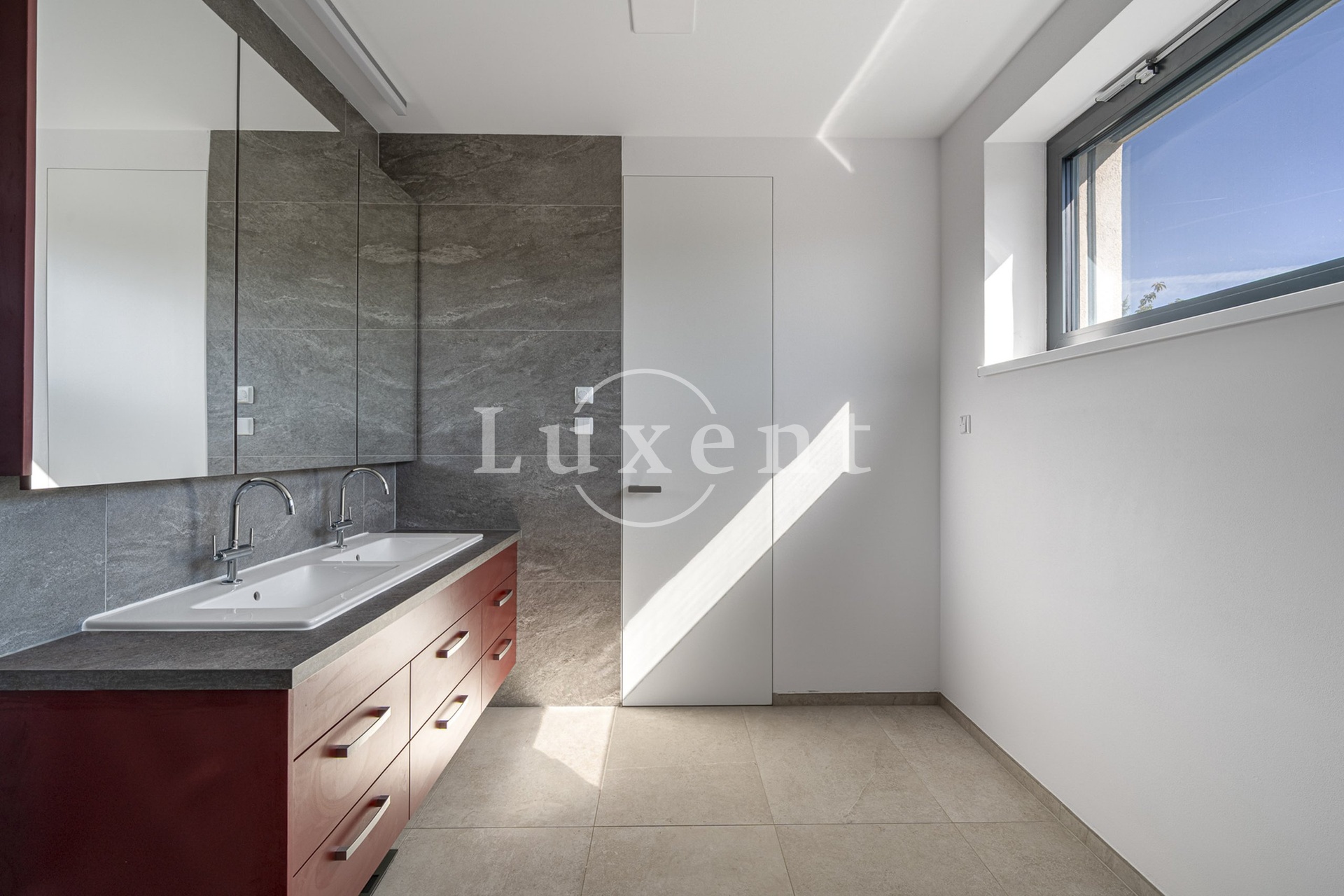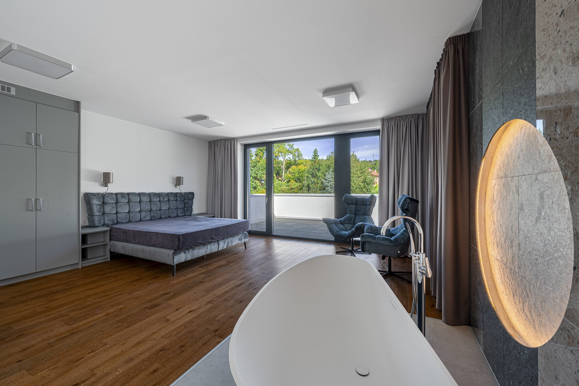 The second floor is designed as a relaxation zone. The master bedroom offers a unique atmosphere thanks to a freestanding bathtub, original stone inlay with a space motif, and an adjoining en-suite bathroom. The bedroom also has direct access to a private terrace facing the garden. There is also a second bedroom with a terrace and en-suite bathroom, and another room that can be used as a dressing room or study, with an adjoining small room with a kitchenette. The house is equipped with custom-made furniture, air conditioning in all living areas, outdoor blinds, heat recovery in the bedrooms, two heat pumps, and solar panels on the roof, which significantly reduce operating costs.