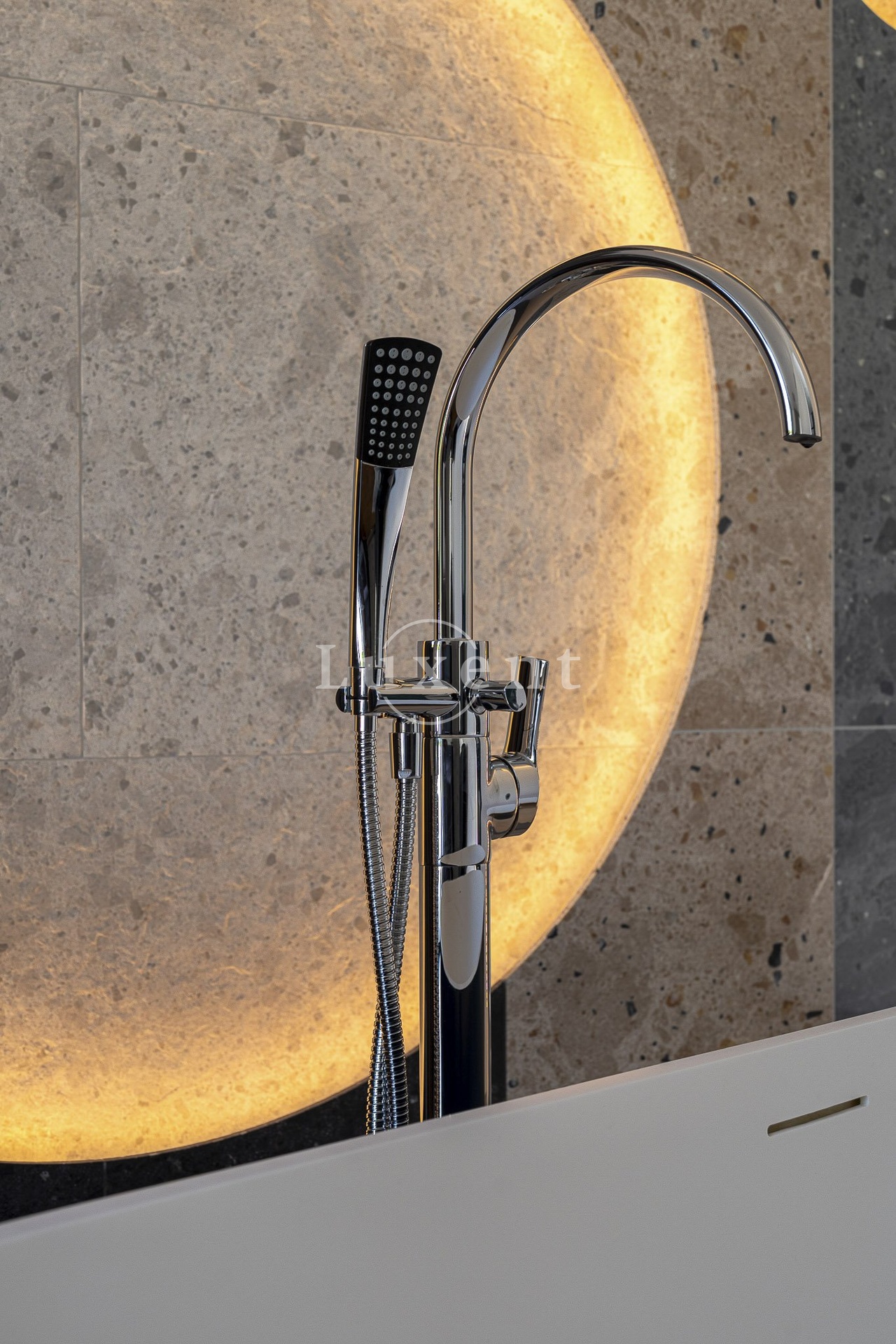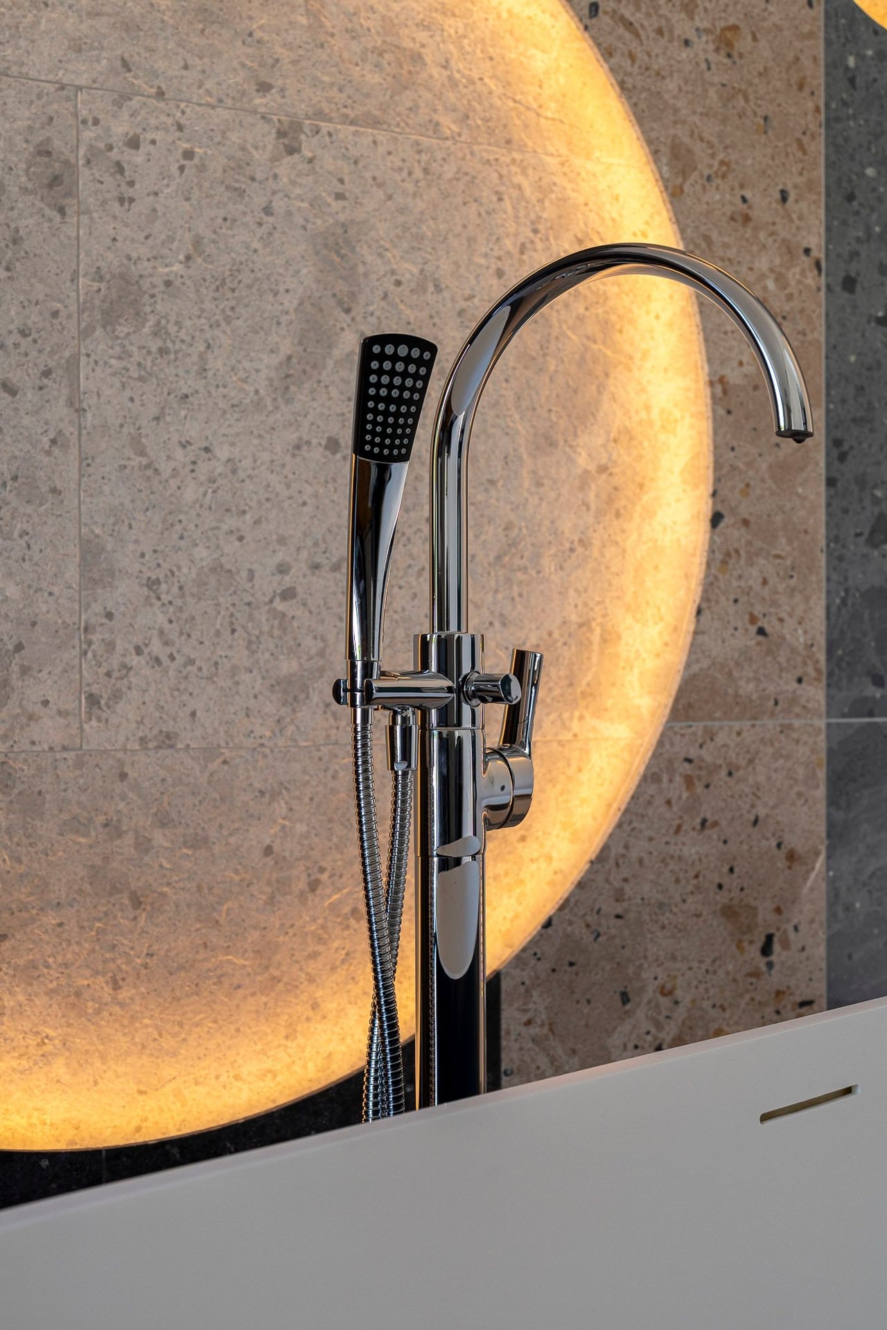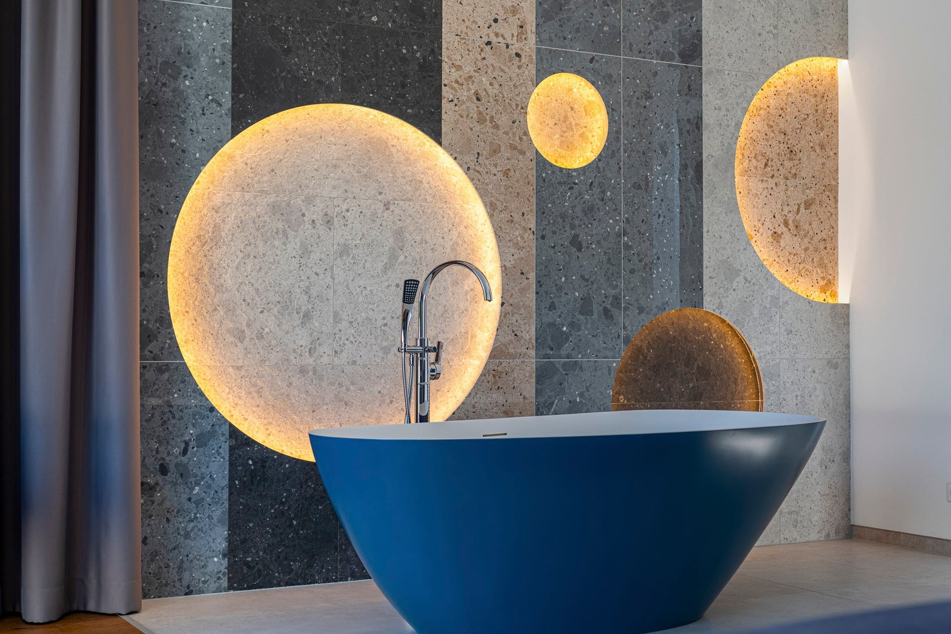 The second floor is designed as a relaxation zone. The master bedroom offers a unique atmosphere thanks to a freestanding bathtub, original stone inlay with a space motif, and an adjoining en-suite bathroom. The bedroom also has direct access to a private terrace facing the garden. There is also a second bedroom with a terrace and en-suite bathroom, and another room that can be used as a dressing room or study, with an adjoining small room with a kitchenette. The house is equipped with custom-made furniture, air conditioning in all living areas, outdoor blinds, heat recovery in the bedrooms, two heat pumps, and solar panels on the roof, which significantly reduce operating costs.