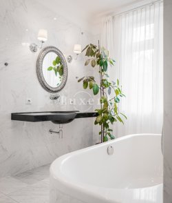 Disposition of the villa: 7+1 with a separate apartment and fitness in the 1st floor.  Ceiling heights range from 2.8 m to 3 m. On the 1st floor there is a living room, bedroom with original stucco ceiling, bathroom and dressing room, dining room, kitchen with pantry, entrance hall and vestibule with dressing room, laundry room and separate toilet; on the 2nd floor there is a living room, bedroom with original stucco ceiling, bathroom and dressing room. On the 1st floor there is an apartment/office with its own entrance, facilities and archive (44 m²), fitness room (37,17 m²), cellars 43,61 m², workshop and garage with toilet. In front of the villa there is a granite-paved courtyard and a separate new double garage, additional parking space is then in the courtyard or in front of the electrically operated entrance gate.
