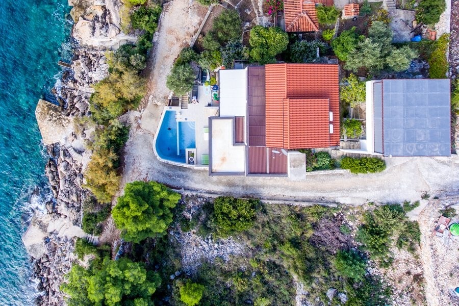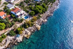 The property is located in a completely quiet and private area, just a few steps from a natural pebble beach. This location ensures unobstructed sea views and direct access to the coast. The uniqueness of the entire offer is underlined by its distance of only 25 km from Split Airport, which ensures excellent accessibility for both private and investment purposes.