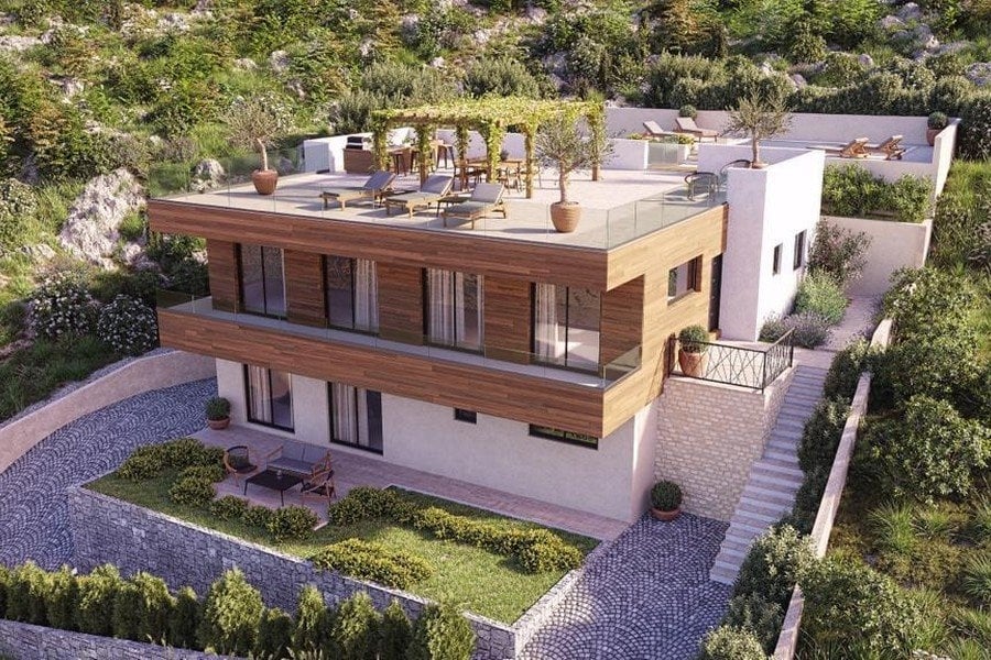 We offer for sale a modern villa with a beautiful roof terrace and open views of the Adriatic Sea, located on the Croatian coast, in the first row by the sea. The villa has a living area of 220 m² and stands on a spacious plot of 600 m².