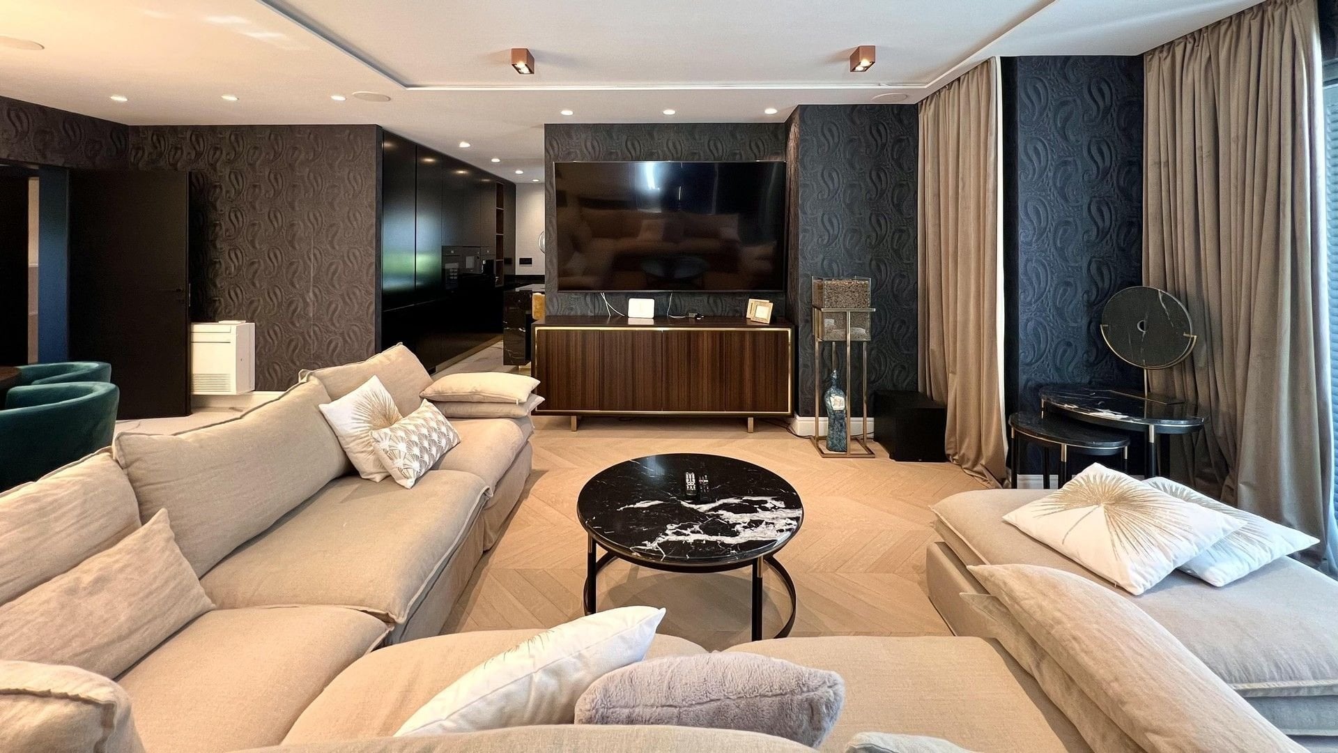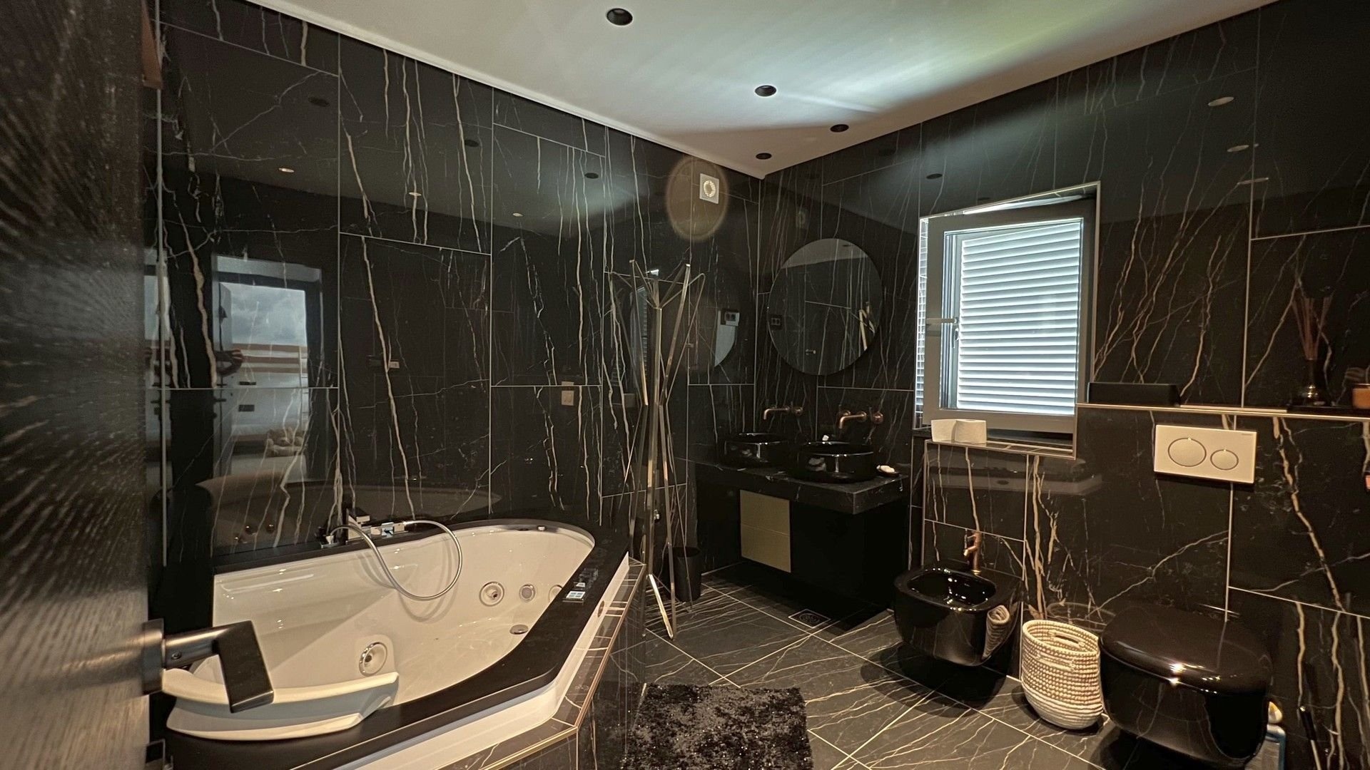 The entire villa is equipped with high-quality designer furniture and the handmade, custom-made joinery adds to the feeling of comfort. In addition to the top security provided by burglar-proof doors, glass walls with UV protection reduce heating by 25% – 30%, while the underfloor heating system that extands throughout the property and air conditioning ensure comfort in the villa.