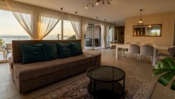 On the ground floor there is a modern kitchen and a spacious living room with beautiful sea views. There is also a bedroom with a private bathroom and direct access to an open terrace with an outdoor dining area, barbecue, and swimming pool.
