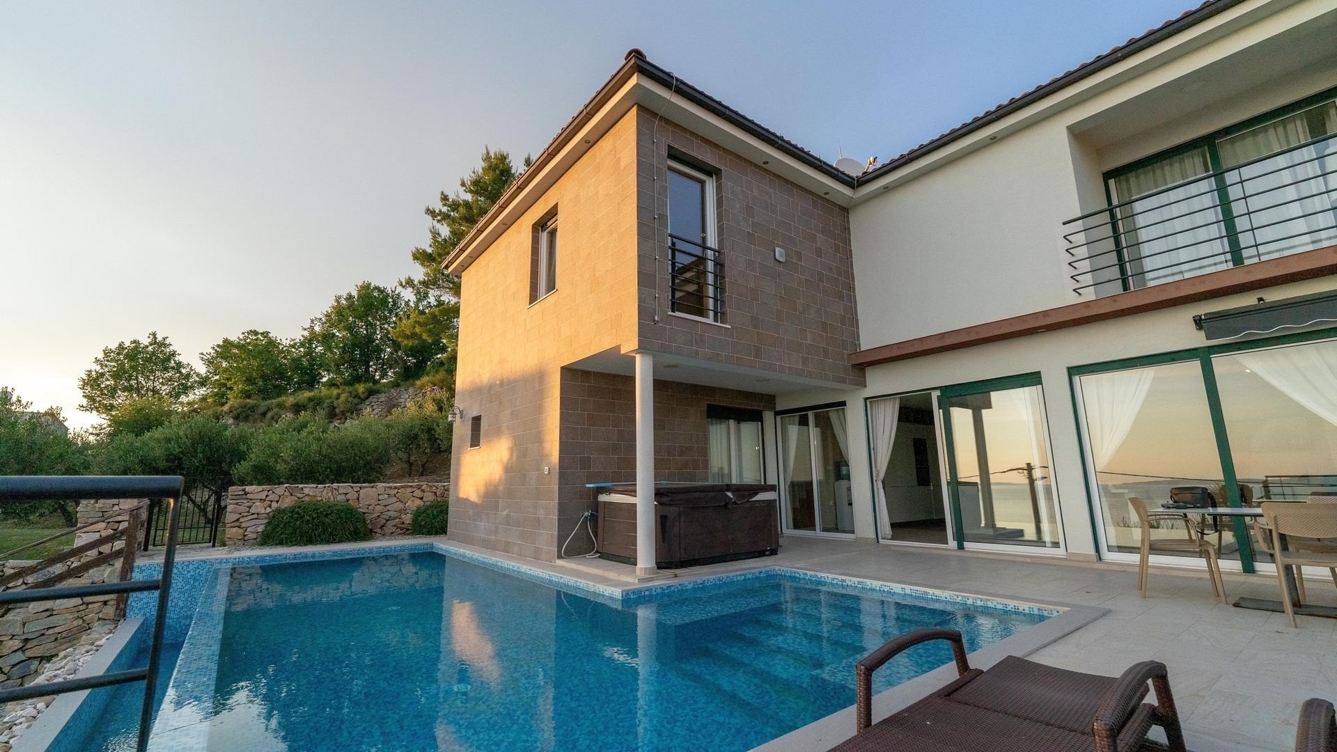 The second villa is designed as two separate apartments, each with its own entrance, and is ideal for both larger families and tourist rentals. In total, it offers four spacious bedrooms, four bathrooms, an outdoor fireplace, and a swimming pool with a heating system. There are two open, partially covered terraces that ensure a comfortable stay outdoors.