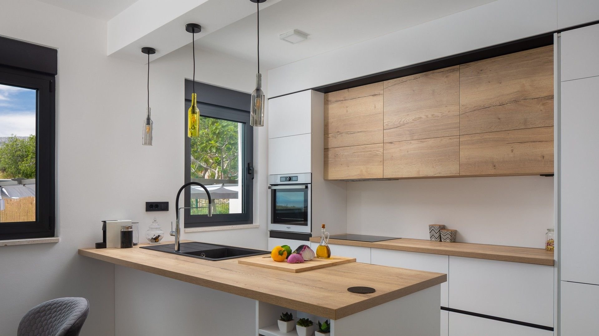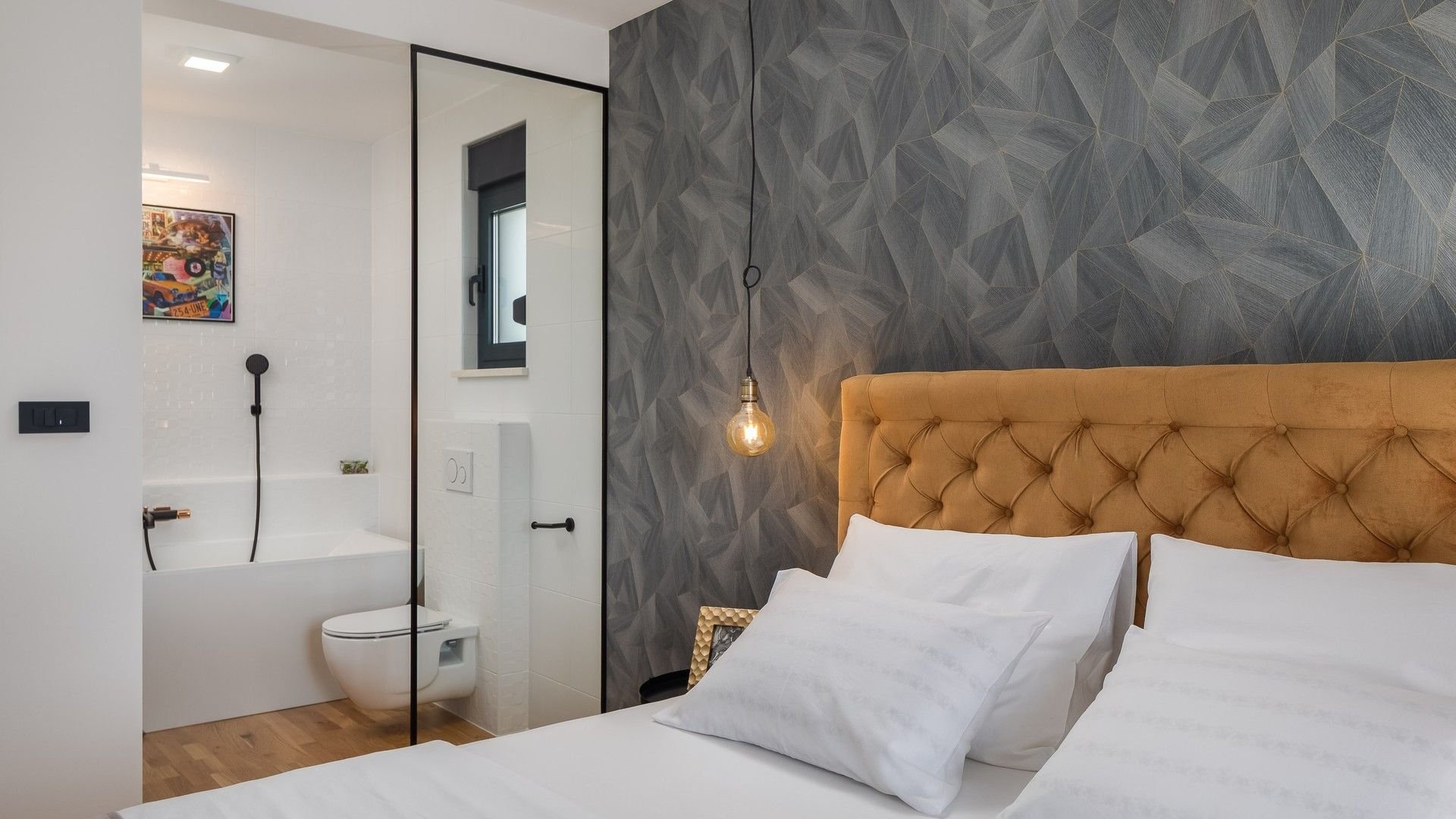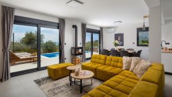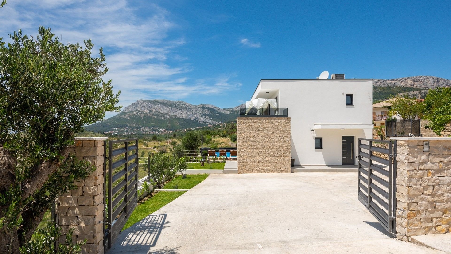 The villa is located in a quiet area on the Croatian coast, offering beautiful views of the azure sea, a pleasant microclimate, and a typical Mediterranean atmosphere with the scent of pine trees and sea air.