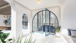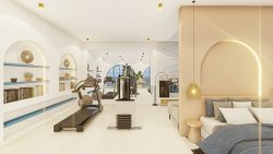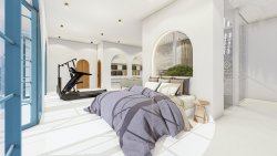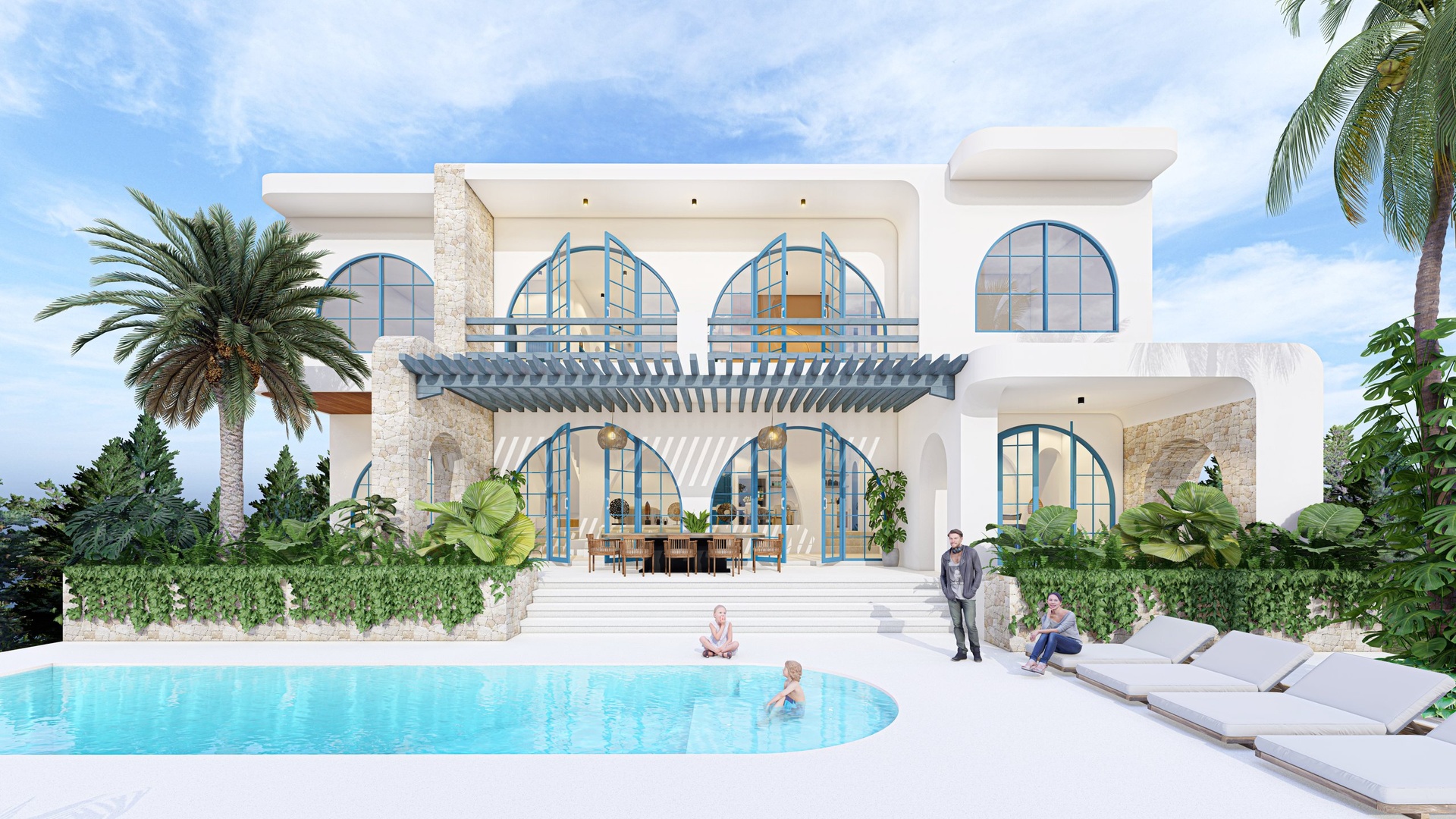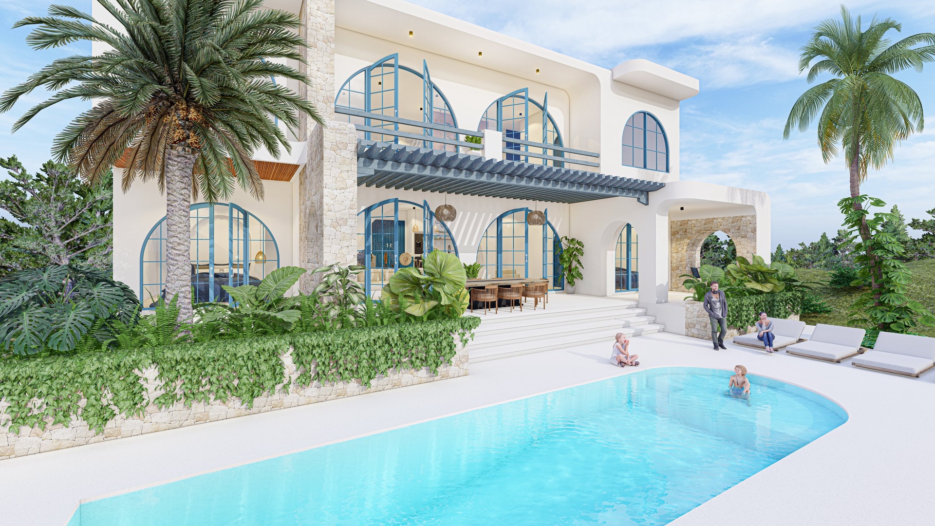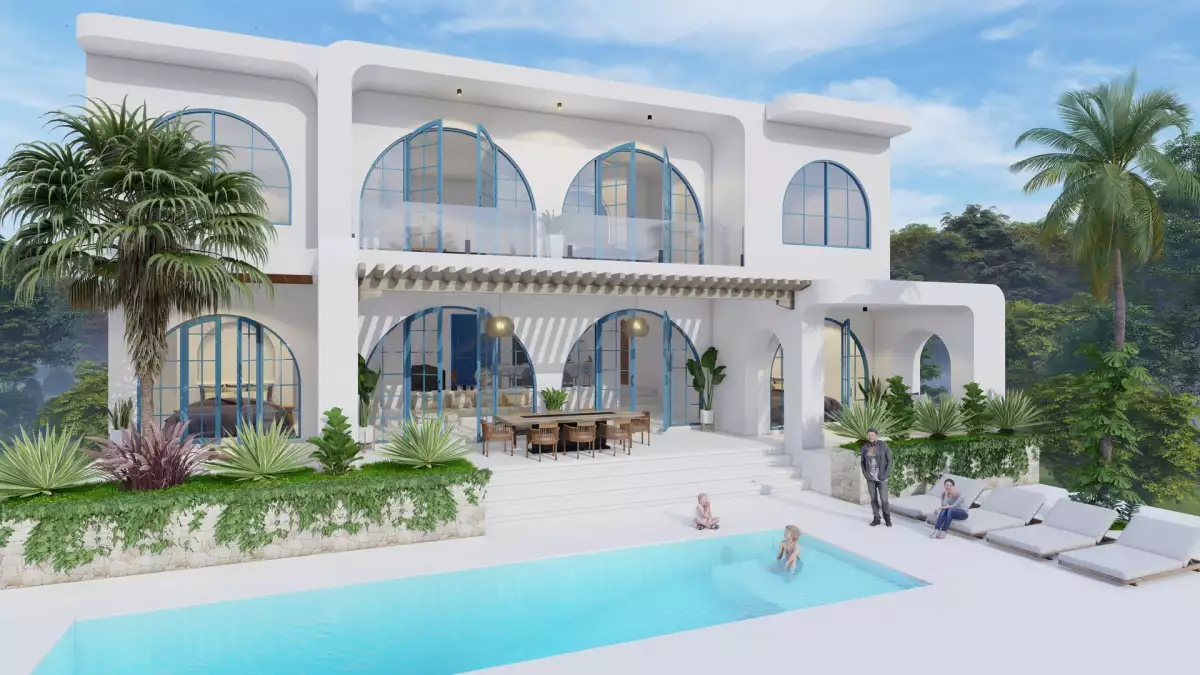 The villa with a total floor area of 323 sqm on a plot of 800 sqm features a spacious living room with kitchenette, three bedrooms, a loggia and a spacious terrace with a large private pool.