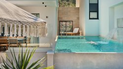 On the second floor, there is a bedroom with its own bathroom and direct access to a terrace equipped with outdoor furniture and a jacuzzi. The third floor offers three bedrooms, each with its own bathroom, and access to a terrace partially covered by natural greenery, which creates a unique atmosphere of privacy and tranquility.