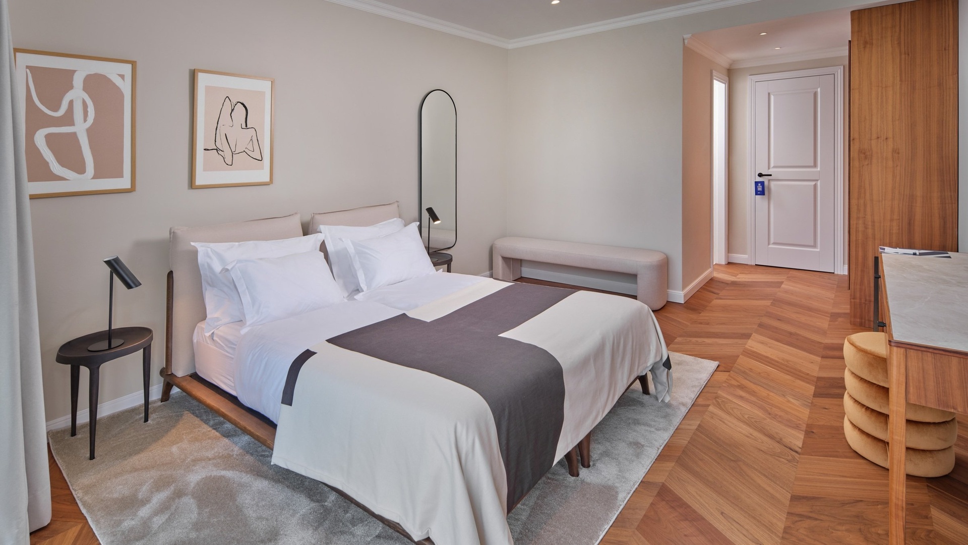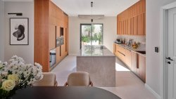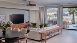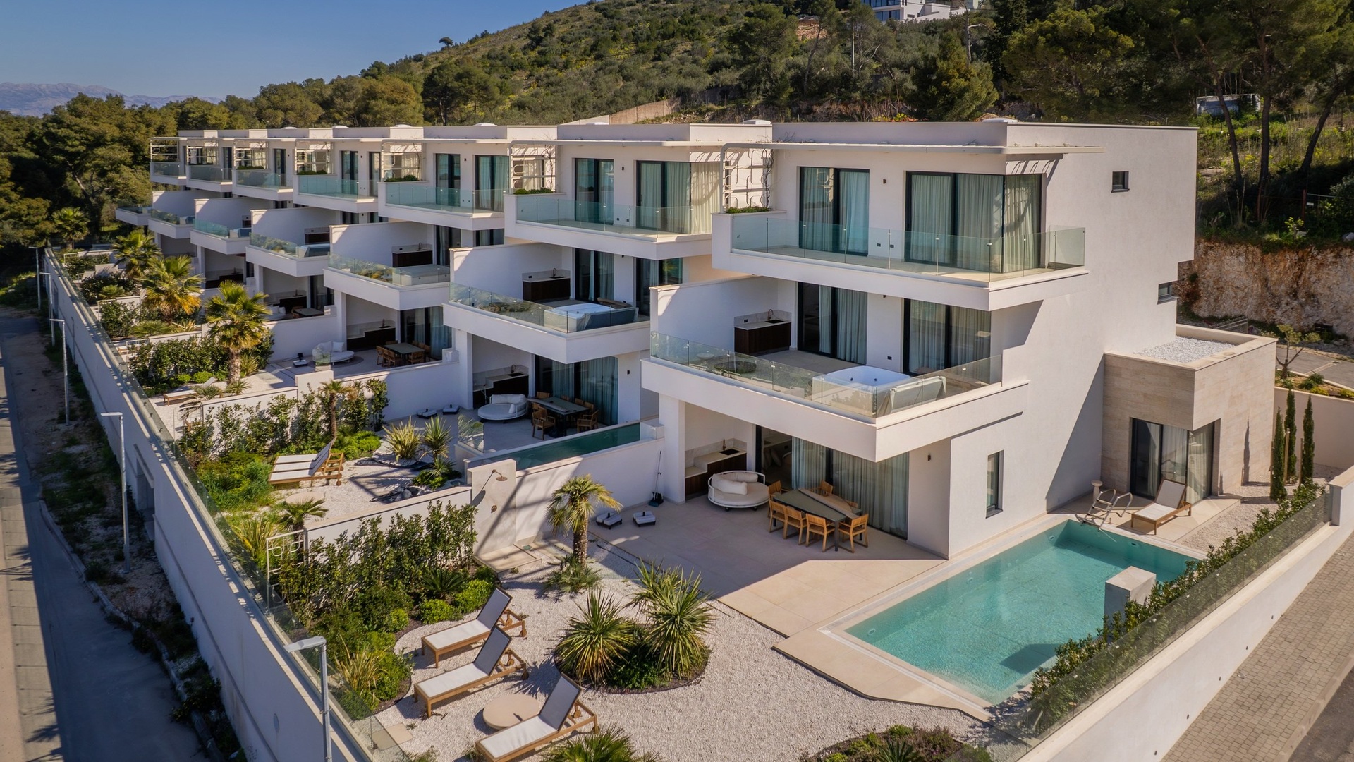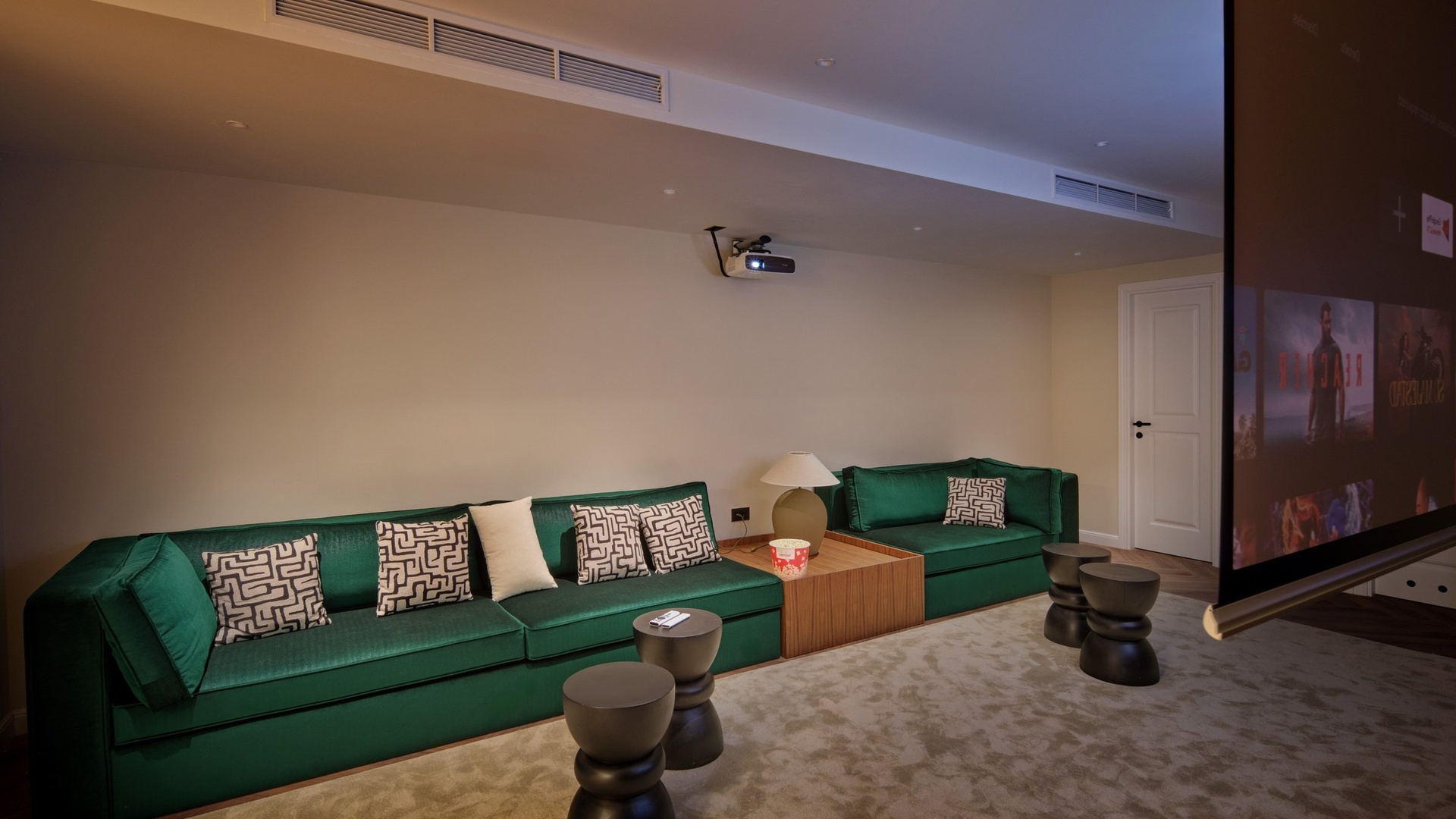 The interior of the villa is furnished to hotel standards and complemented by above-standard amenities such as a heated infinity pool, jacuzzi, private garden, home fitness center, sauna, fully equipped kitchen, and private cinema.