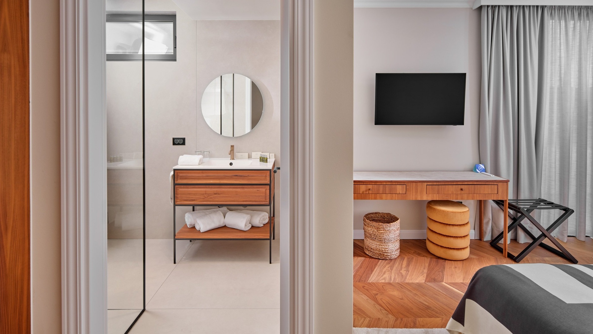 The villa is spread over three modern and precisely equipped floors. The main living floor offers a bedroom, bathroom, fully equipped kitchen with dining area, and a spacious living room with access to a generous terrace with a heated infinity pool, outdoor seating, and an adjoining private garden planted with Mediterranean vegetation.