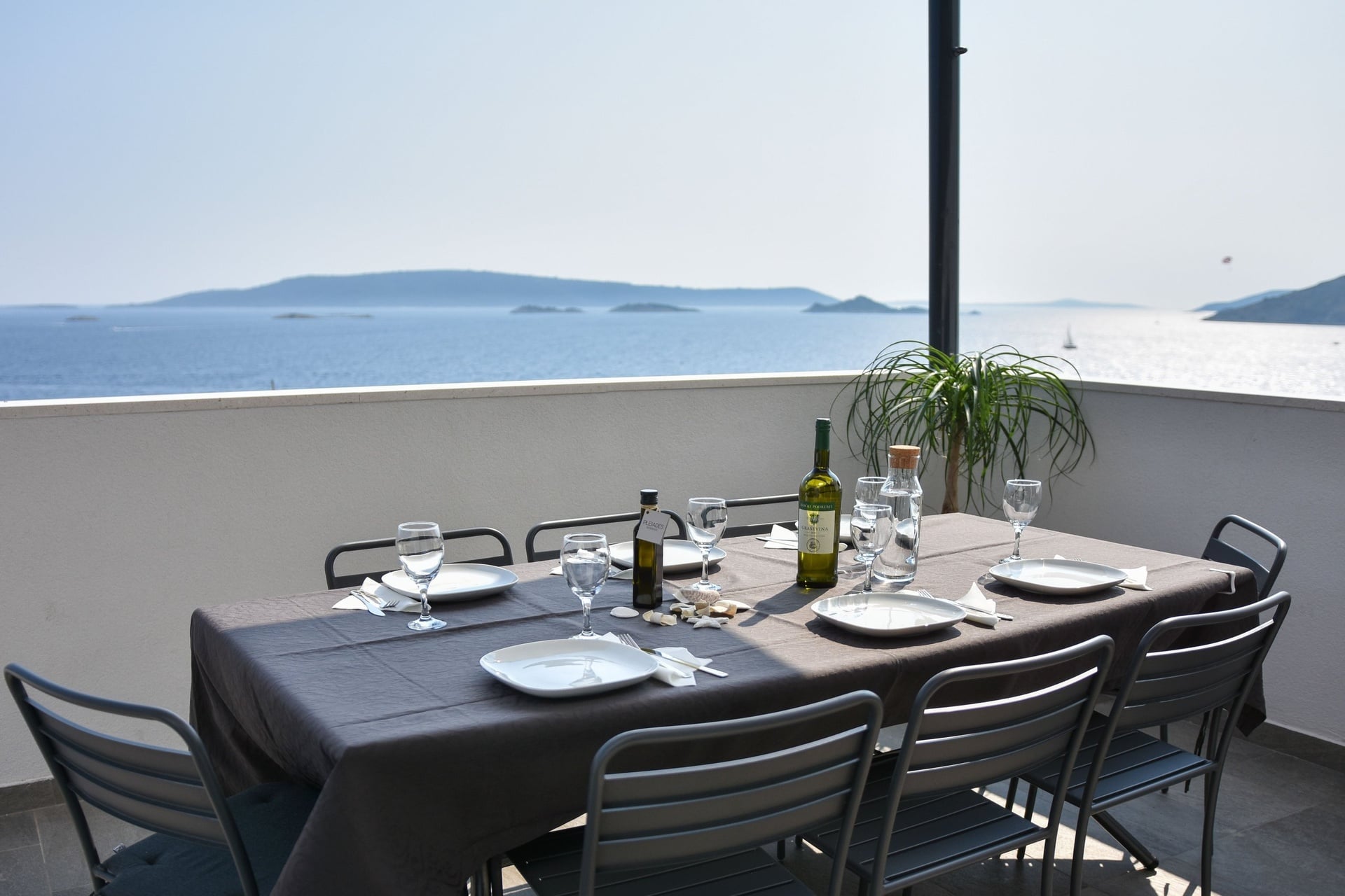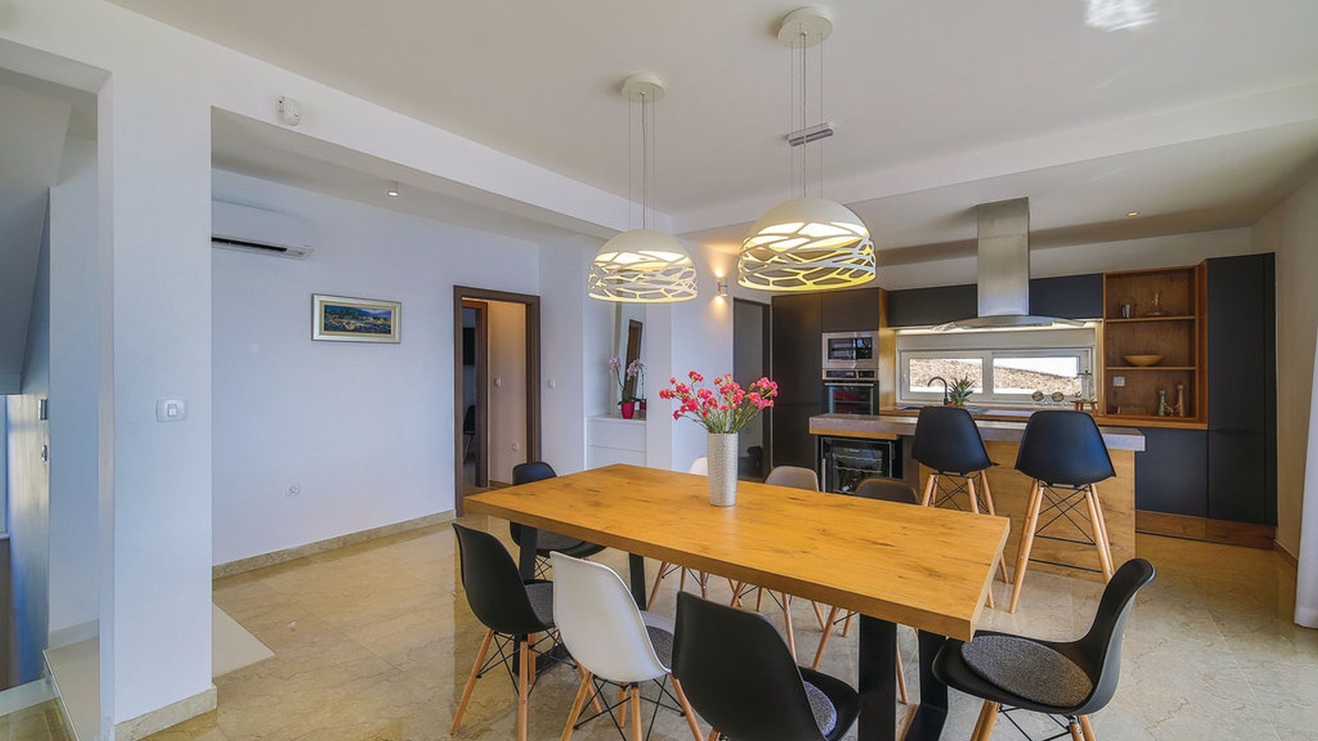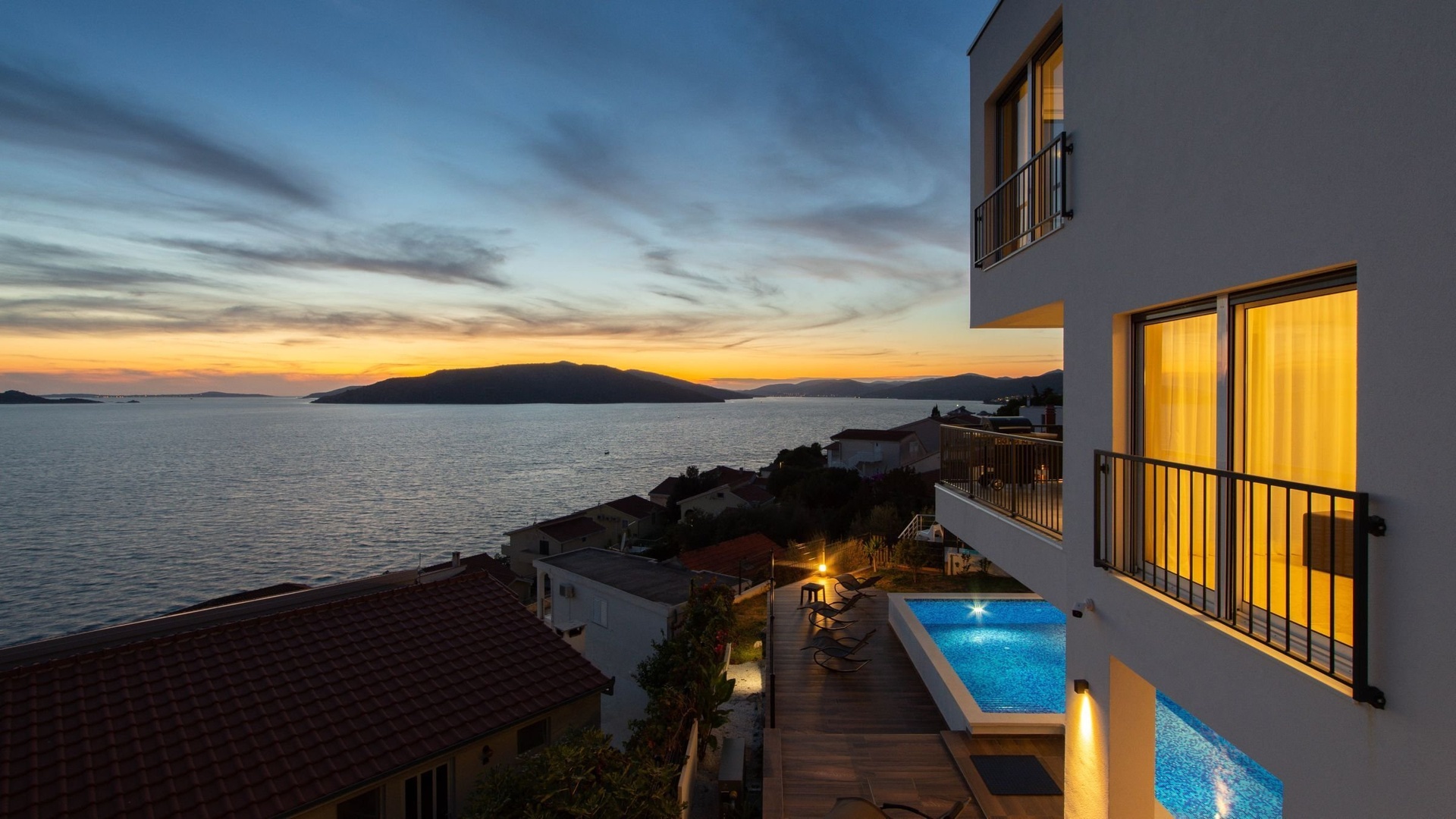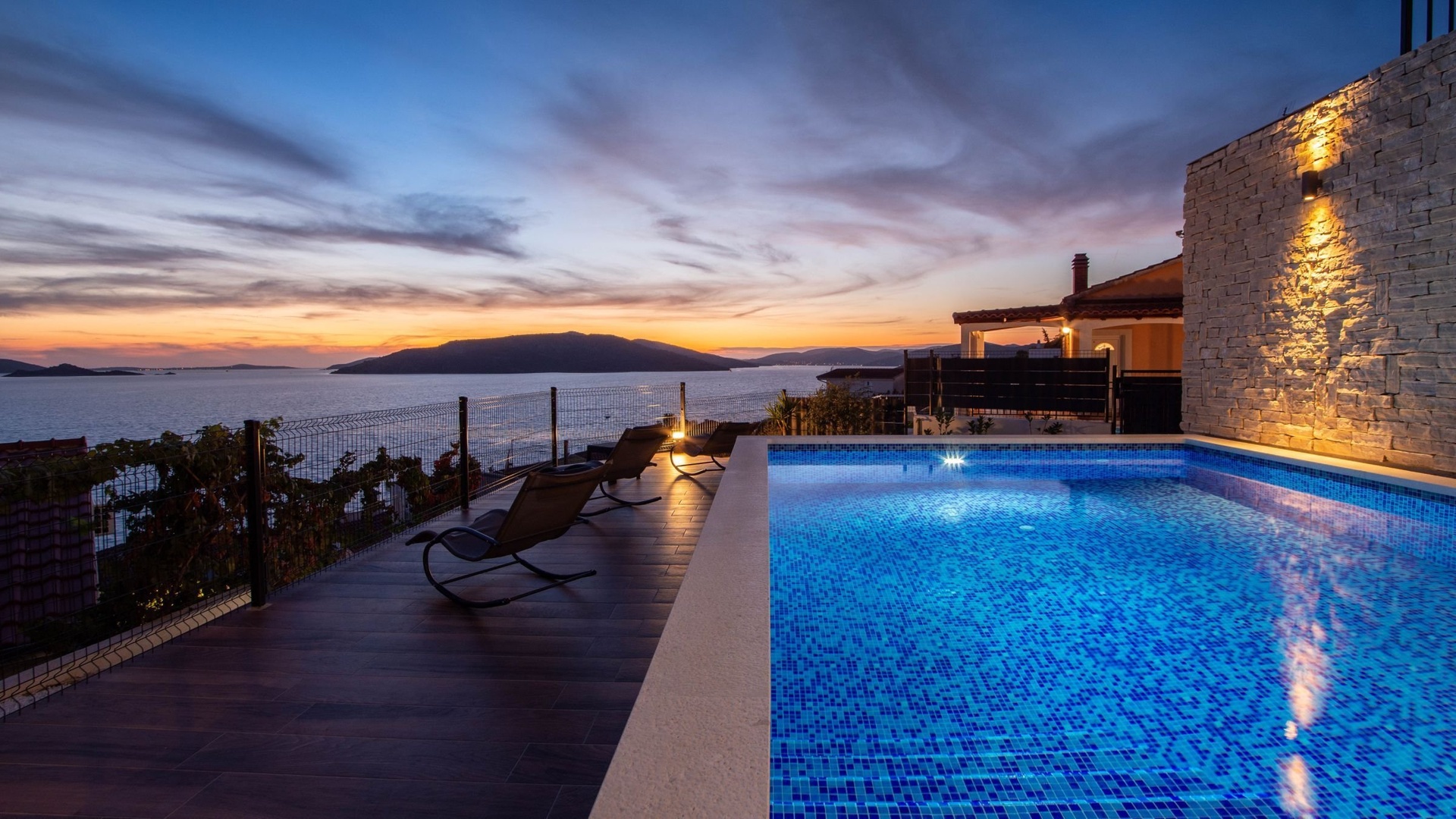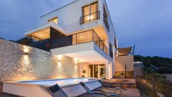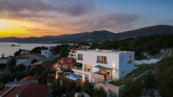 For sale we offer an elegantly furnished villa with a total living area of 325 m², situated in a quiet location on the island of Ciovo, on a plot of 556 m². This modern villa is spread over three floors, which are thoughtfully interconnected with an emphasis on comfort, privacy and making the most of the magnificent sea views.