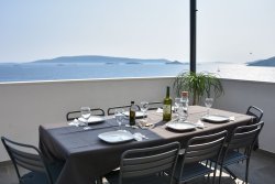 On the ground floor of the villa there is a wellness area with sauna, jacuzzi and direct access to the large 33 m² heated swimming pool, which is surrounded by a spacious sun terrace and greenery. The second floor offers a comfortable bedroom with en-suite bathroom, a fully equipped kitchen with dining area and a spacious living room. From there, French windows open onto an outdoor terrace, offering breathtaking panoramic views of the sea and the surrounding countryside. The third floor is designed as a quiet zone with four separate bedrooms, each with its own bathroom, ensuring absolute comfort for a larger family or group of guests.