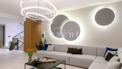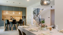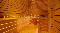 This modern villa with a usable area of 370 sqm stands on a plot of 750 sqm and spreads over three floors. In the basement you will find a fully equipped gym, sauna with shower, bathroom and laundry room. The ground floor offers an open concept with kitchen, dining room and spacious living room with large glass walls that connect the interior to the terrace and landscaped garden. The outdoor area features a heated pool, sun deck, outdoor kitchen with grill and children's playground. Upstairs there are four comfortable bedrooms with en-suite bathrooms - two with showers and two with baths.