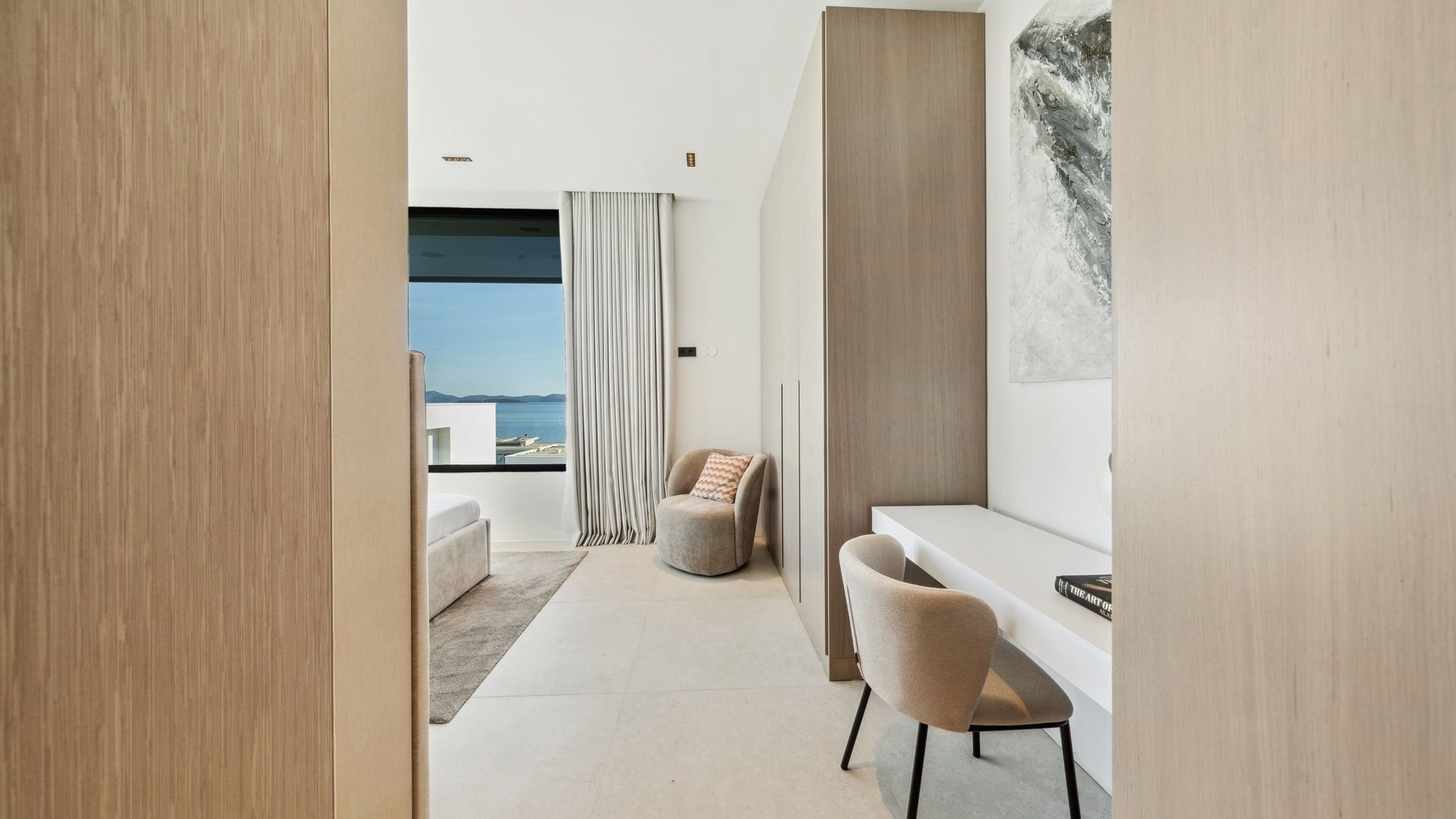 The living area with generous floor-to-ceiling windows flows seamlessly onto the terrace with a summer kitchen and private heated pool. The villa has several bedrooms, each with its own bathroom and built-in wardrobes. Two parking spaces on the property are a matter of course.