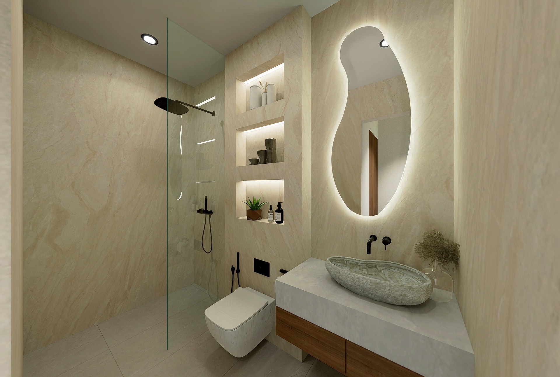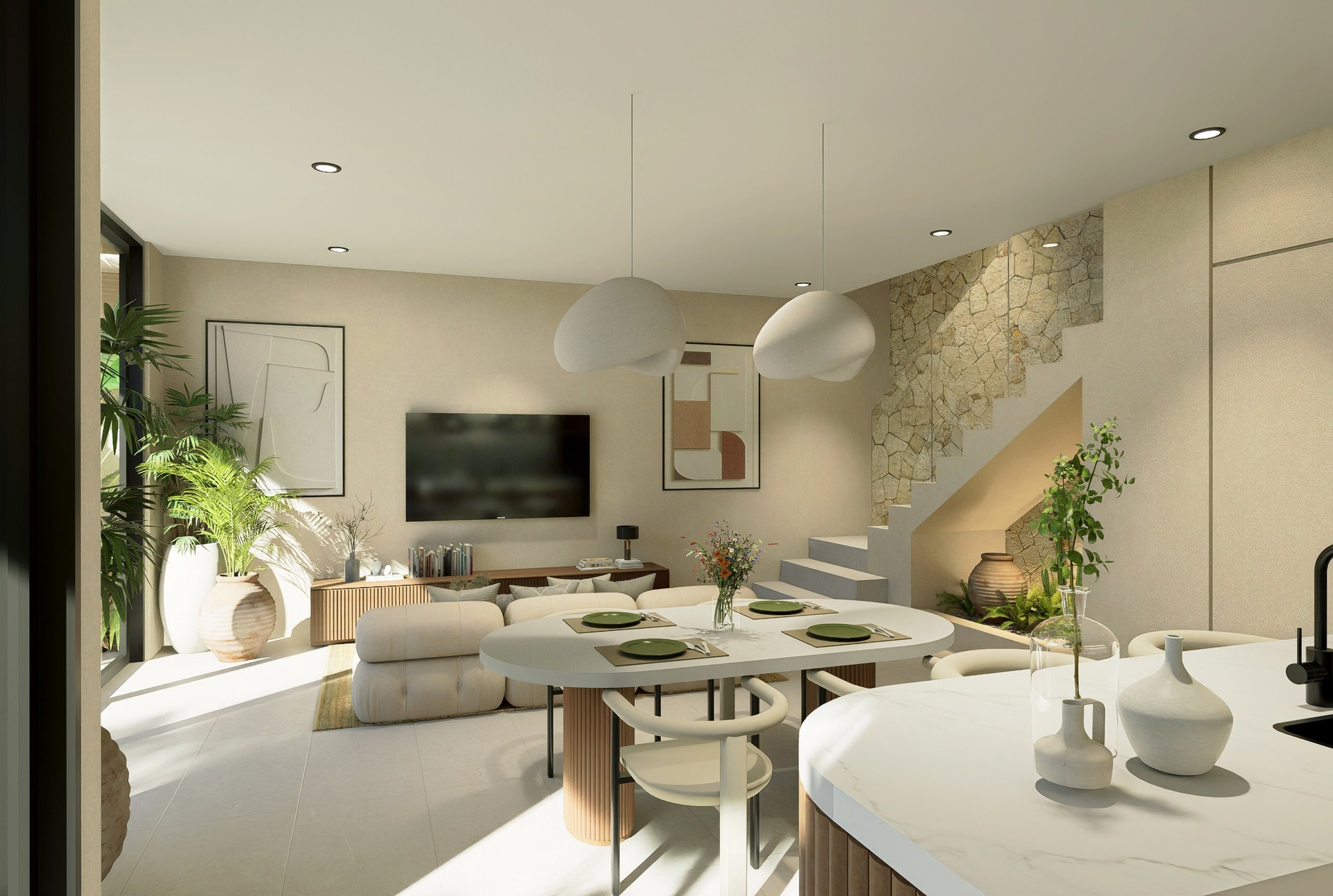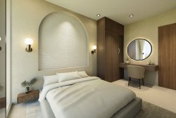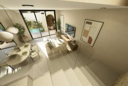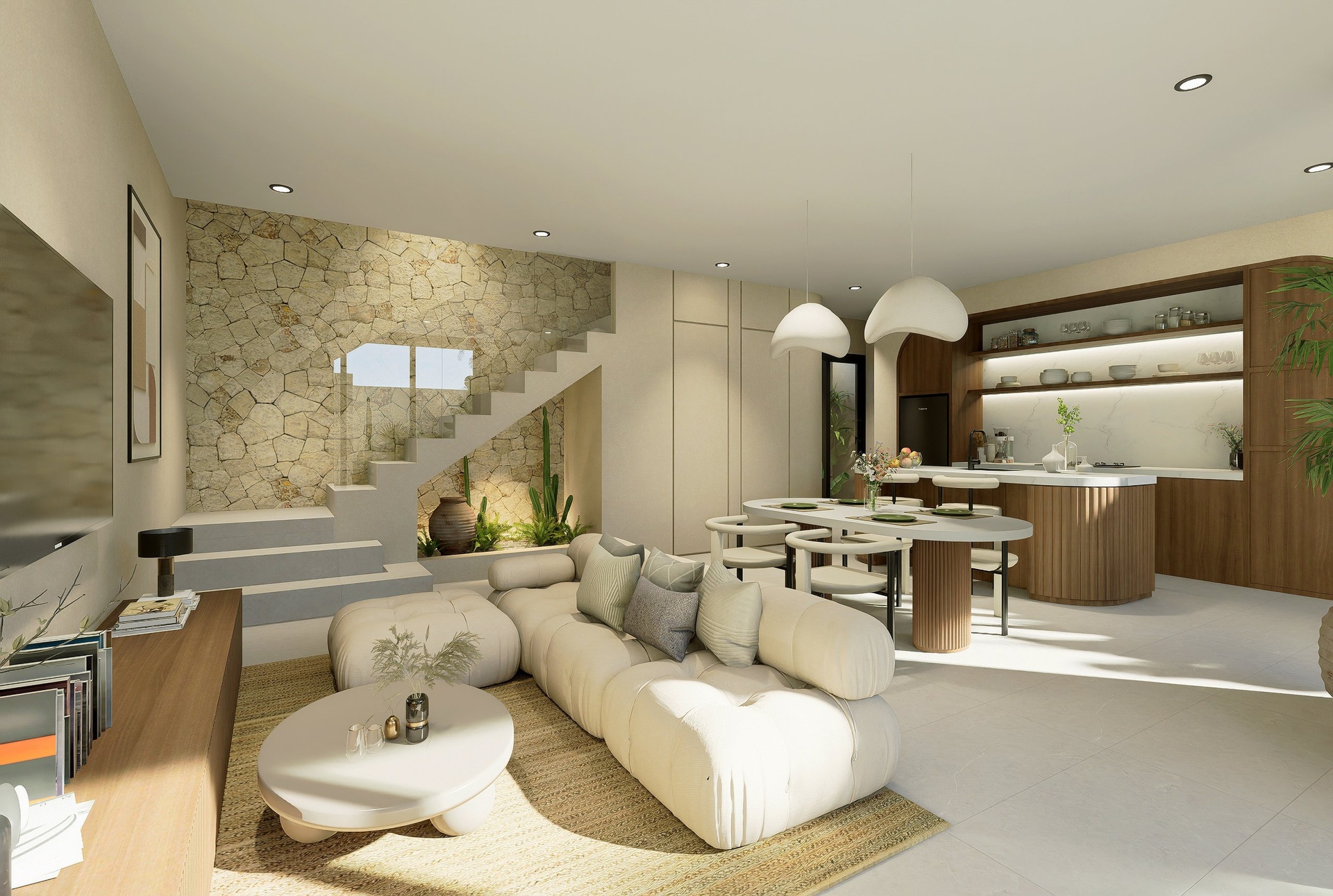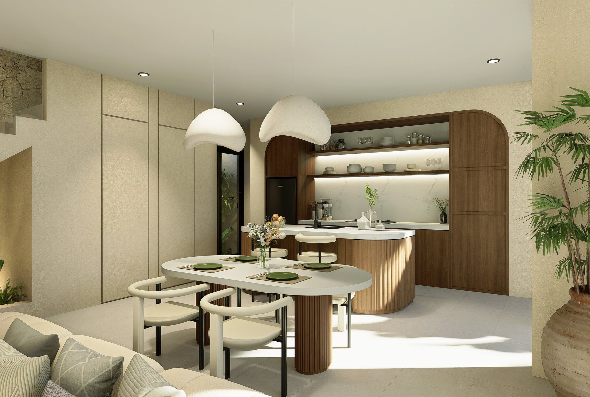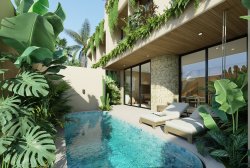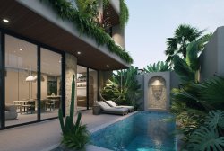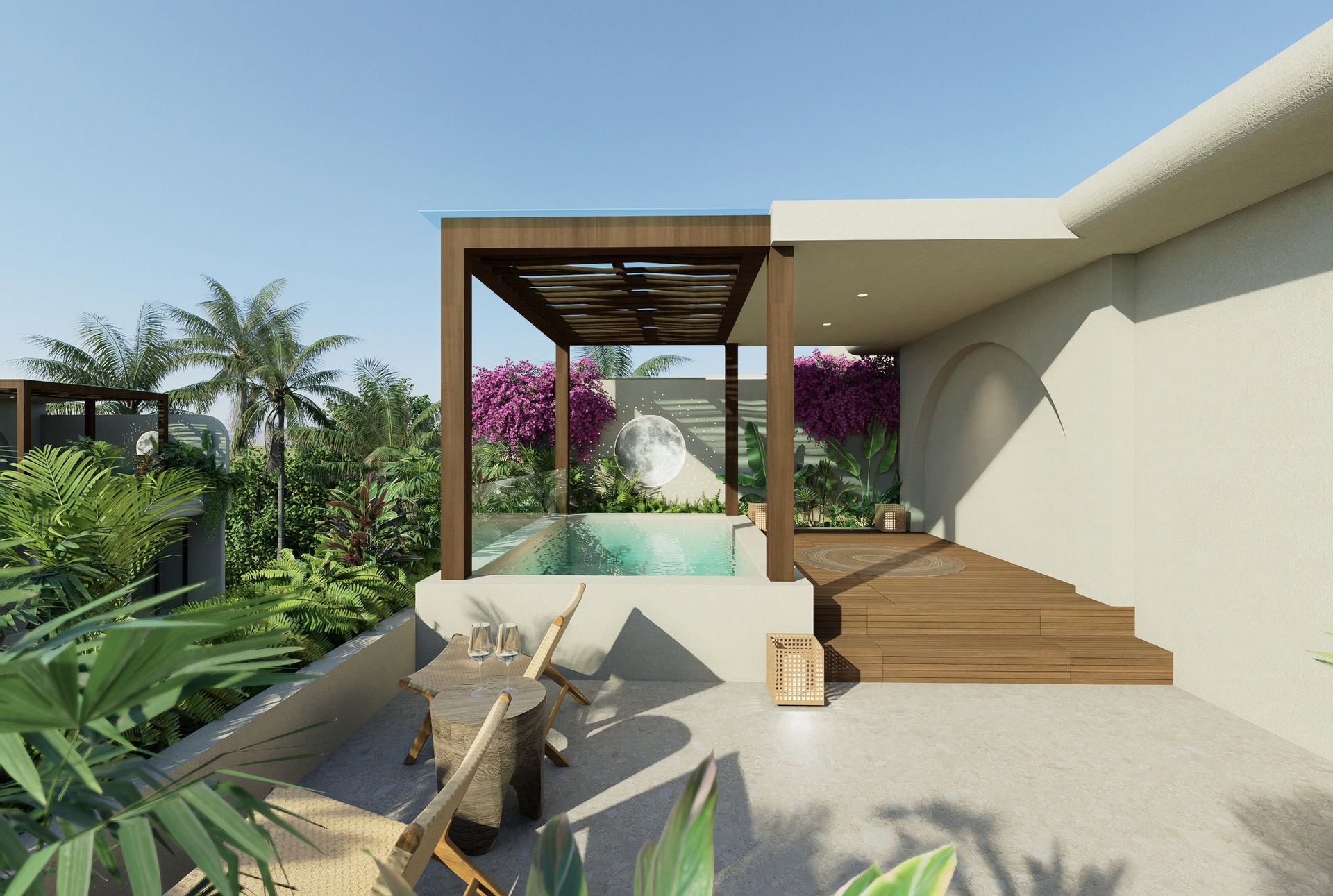 The villas represent the perfect blend of luxury, modern design, and stunning views of the tropical landscape. Each villa features an airy interior with large glass windows, an elegant sunken living area, and two bedrooms with private bathrooms. The fully equipped kitchen boasts premium finishes. The outdoor space includes a private pool, exotic garden, and a terrace with a jacuzzi, where you can enjoy breathtaking views of the ocean and surrounding scenery. Smart solutions, such as ample built-in storage, a multifunctional room, and a spacious garage for a car and two bikes, ensure maximum comfort and practicality.