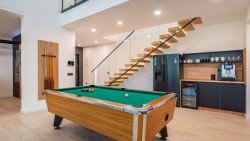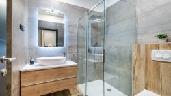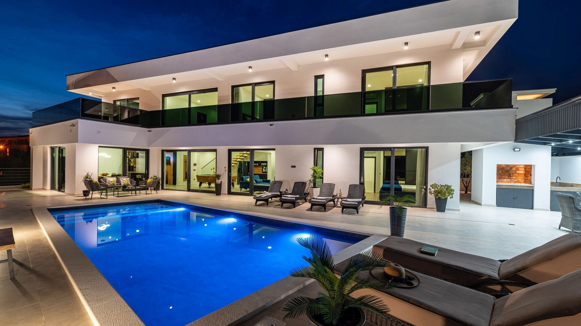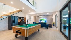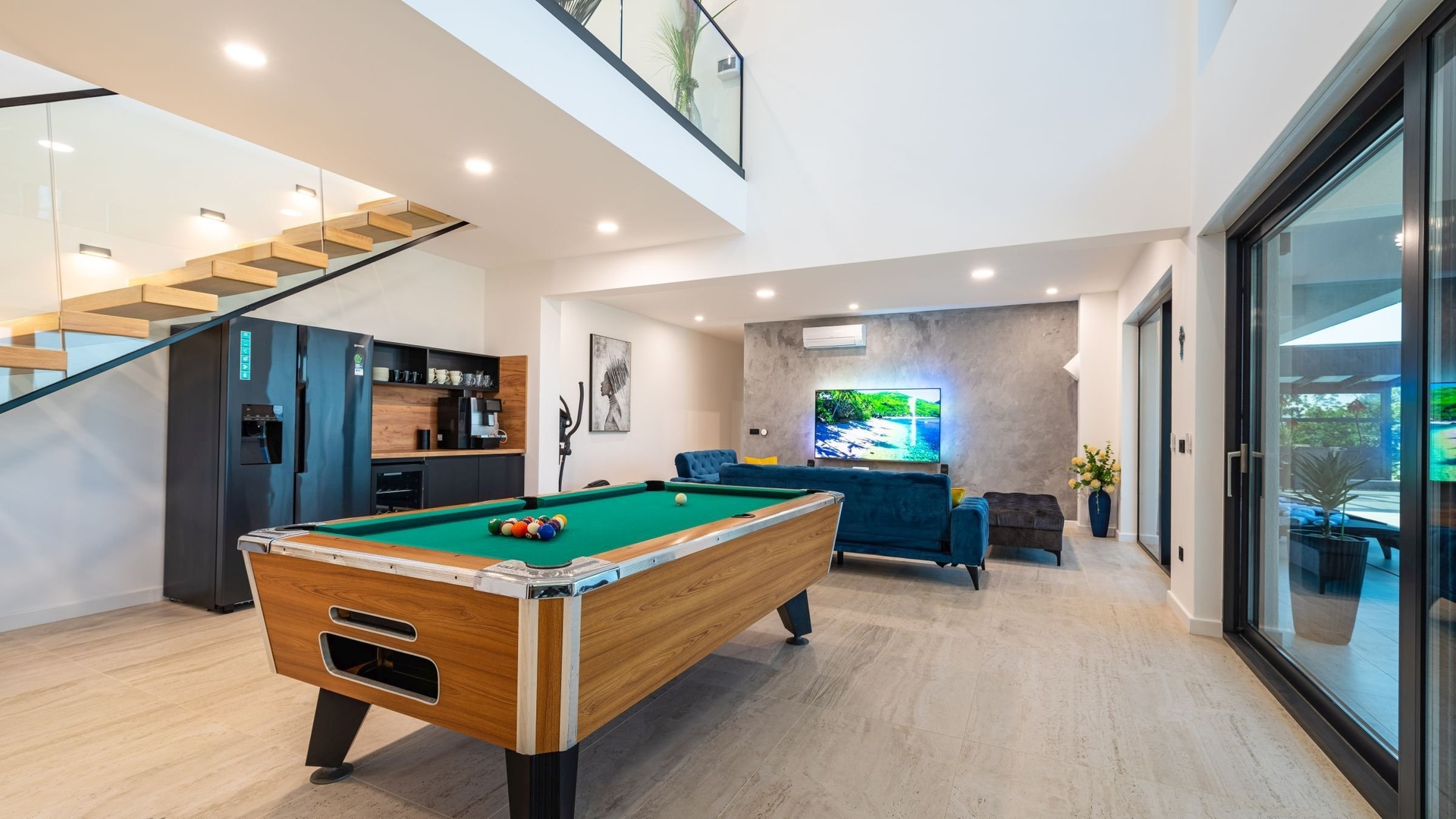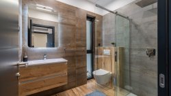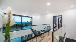 On the ground floor, there is an entrance area that seamlessly flows into an open space with a spacious, fully equipped kitchen and dining area. The living room, featuring a relaxation zone, is equipped with a pool table, coffee machine, wine fridge, and PlayStation, creating the perfect space for relaxation and entertainment. The ground floor also includes one bedroom with an en-suite bathroom, an additional toilet, and a laundry room with a washing machine and dryer. All rooms have access to a spacious terrace with a dining area and grill, sun terrace with loungers, and an outdoor seawater pool. This area is ideal for relaxing and enjoying the sea views.