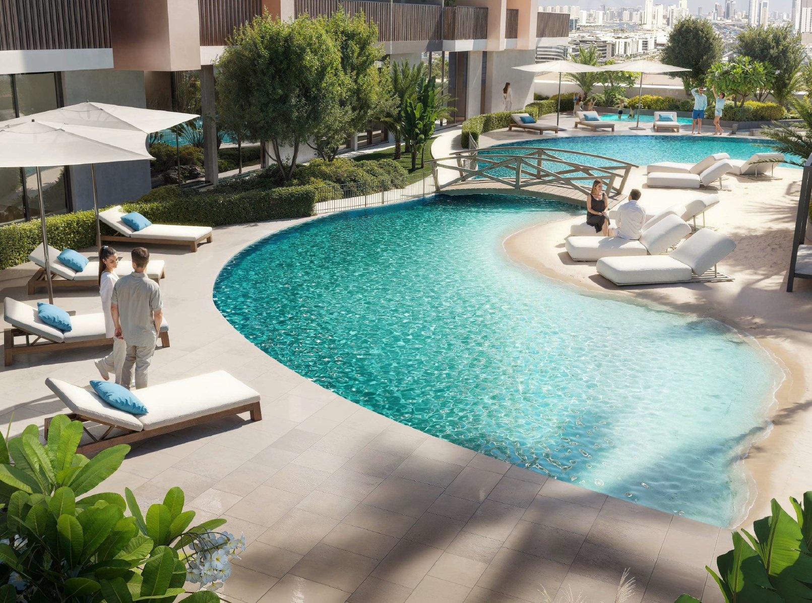 Life at ESSENL1FE adapts to the individual pace of its residents. The project offers a lagoon pool with a sandy beach, a modern fitness center, relaxation areas, and a rooftop infinity pool with panoramic views of Dubai. Each space is designed to promote a balance between an active lifestyle and peaceful relaxation in an environment of discreet luxury.