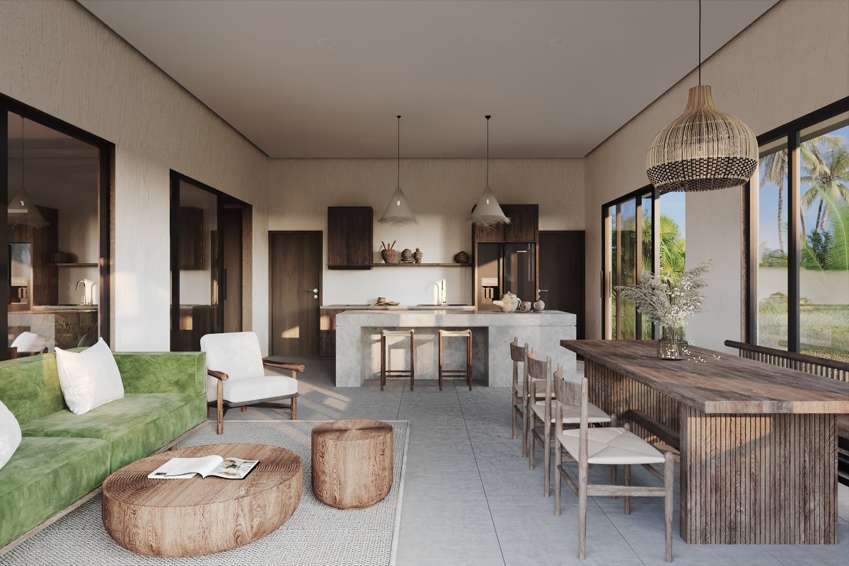 Vybírat lze z domů ve třech variantách – jedna, dvě nebo tři ložnice. Dispozice jsou variabilní a lze je podle přání upravovat. Společenská obývací část interiéru je oddělena praktickou vstupní chodbou od ložnic a koupelny. Přitažlivý a funkční minimalistický design domů pak doplňují rozsáhlé vlastní pozemky s pramenitou vodou, vzrostlými stromy a úrodnou zahradou, na které můžete sklízet vlastní tropické ovoce. Vedle příjemné atmosféry designového domu získáte tedy i své jedinečné bohaté zelené soukromí. Interiérovými materiály je dřevo a keramická dlažba, ale vybírat lze z mnoha druhů nadstandardních podlah z tropického dřeva.