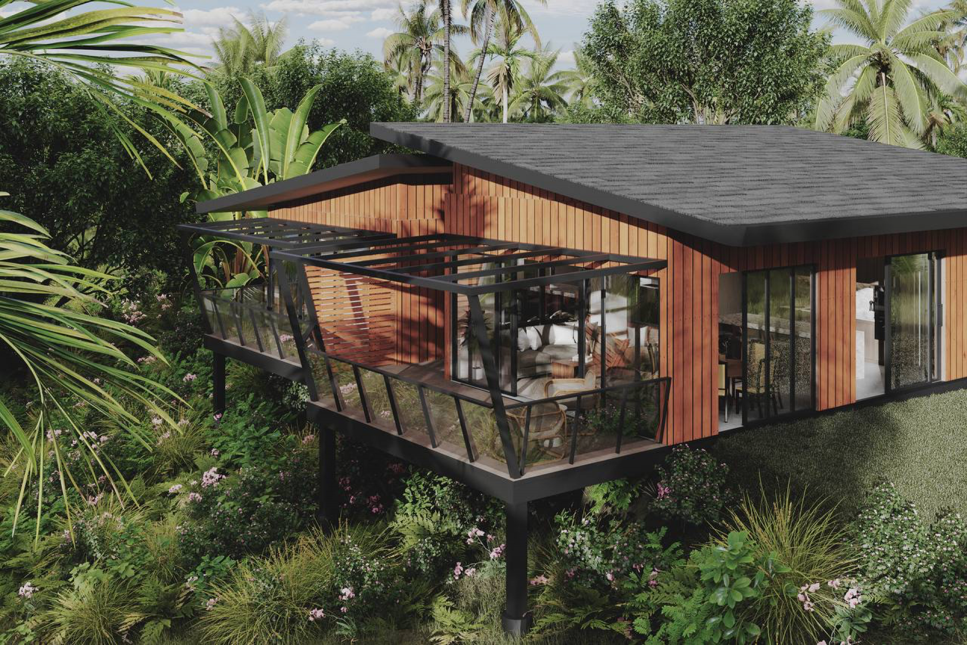 Standardní provedení domů je ve třech variantách – jedna, dvě nebo tři ložnice. Společenská obývací část interiéru je oddělena od ložnic a koupelny praktickou vstupní chodbou. Střechy je možné doplnit solárními panely pro ještě větší soběstačnost. I díky těmto přednostem se Vaše investice bude lépe zhodnocovat. Přitažlivý a funkční minimalistický design domů pak doplňují rozsáhlé vlastní pozemky s pramenitou vodou, vzrostlými stromy a úrodnou zahradou, na které můžete sklízet vlastní tropické ovoce. Vedle příjemné atmosféry designového domu získáte tedy i své jedinečné zelené soukromí.